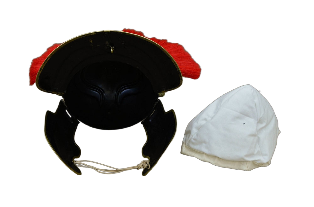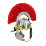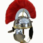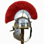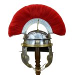Roman helmet of the “Imperial Gallic” type dating back to the mid of the Ist century A.D. topped with a red horsehair crest. It is put on a crest, longitudinally fixed to the helm’s top by a fork-shaped plume holder, a detailed reconstruction of the original. It has pivotable cheekpieces with bosses and lowered neck plate. Entirely made in burnished iron (18 gauge steel) with details in brass-plated metal.