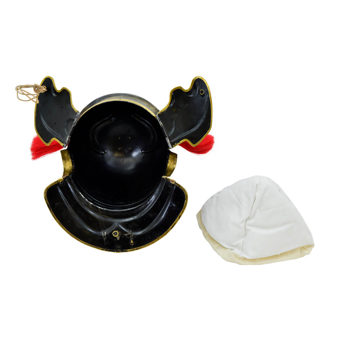 This helm can be converted to having a front-to-back crest alignment by using a crest holder intended for a front to back crest (not included – must be purchased separately). The two brass hooks atop the helm can be used to tie down and secure a front-to-back crest. Due to the hand-made nature of this item, slight differences in size and finish can be expected, making it a truly unique one of a kind collector’s piece.