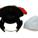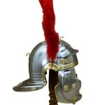 This Imperial Roman Gallic “G” Centurion Helmet is constructed from 18 gauge steel with brass accents. The interior of the helm is blackened and unlined; included with the helm is a separate padded cotton arming cap. The hinged cheekplates have two small rings that can be used to tie a chin strap onto (chin strap included). This helm has a horsehair crest and a brass crest holder; the crest and its holder can be removed if desired. Included are leather cords that can be used to tie down and stabilize the helm to the holes in the visor dome rivets.