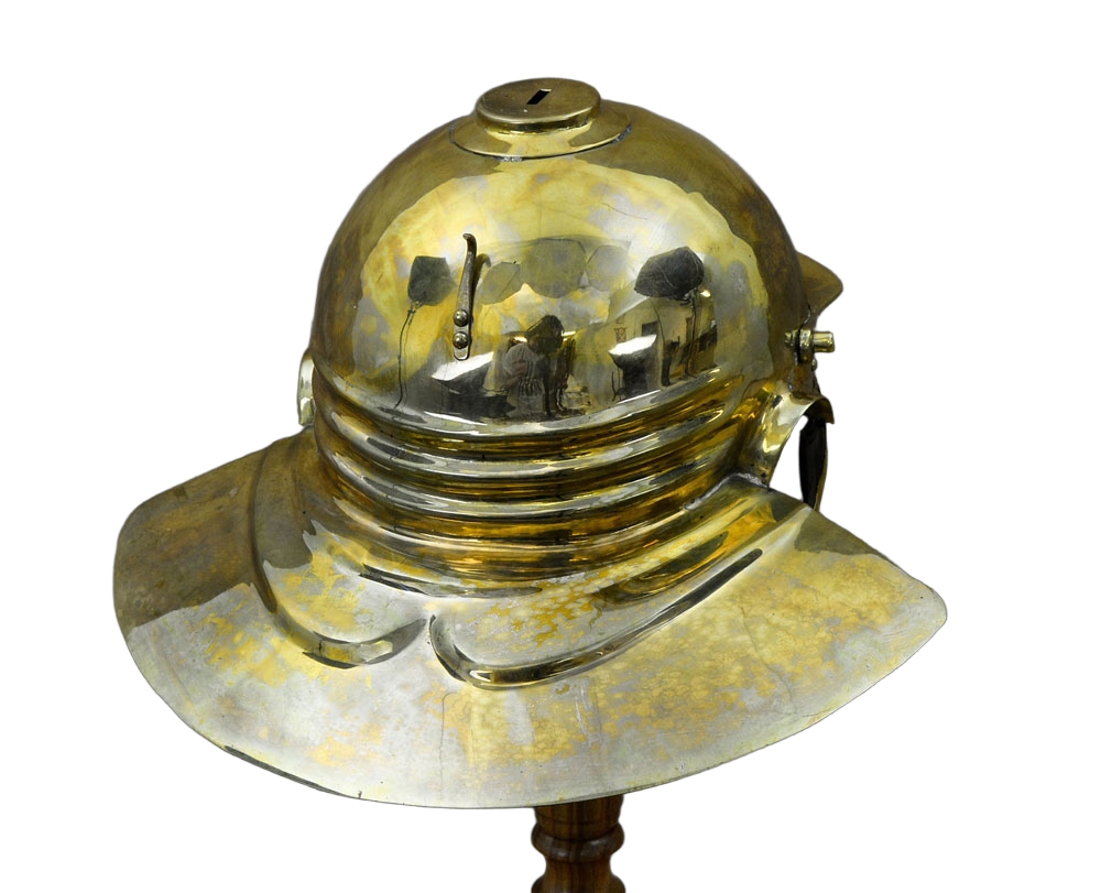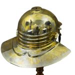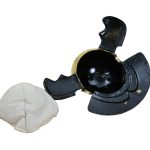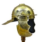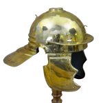 This Imperial Roman Italic ??C?? Helmet is constructed from 18 gauge brass. The inside of the helm is blackened and unlined; included with the helmet is a separate padded cotton arming cap. The cheekplates are hinged and fitted with two small rings to tie a chin strap onto (chin strap not included).