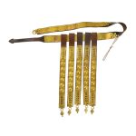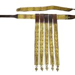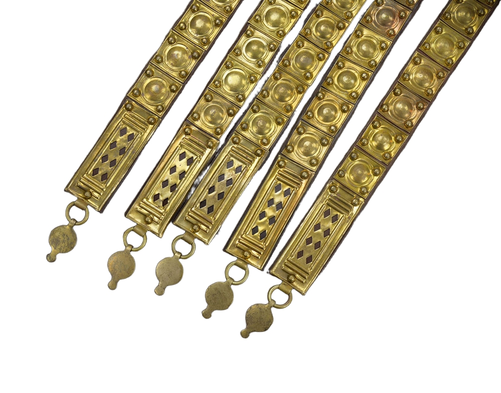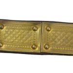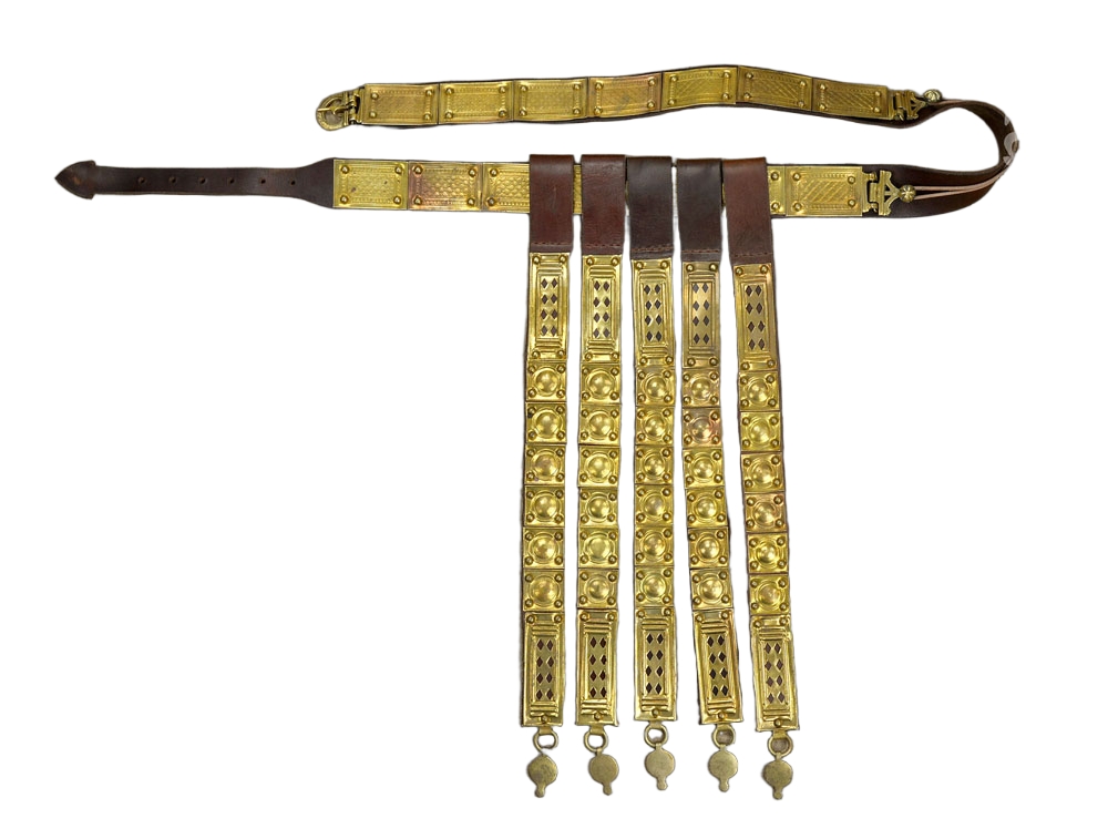 This Roman Soldier?s Belt is constructed from supple, thick leather and fitted with riveted brass plates and a brass buckle. Hinged brass anchor buttons to accommodate a Pugio dagger ( dagger not included) are fitted to the belt. The tassets are of leather with brass plates and they can be slid on and off the belt as needed.
