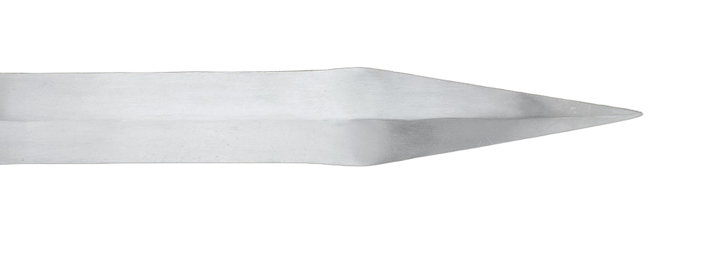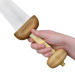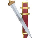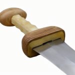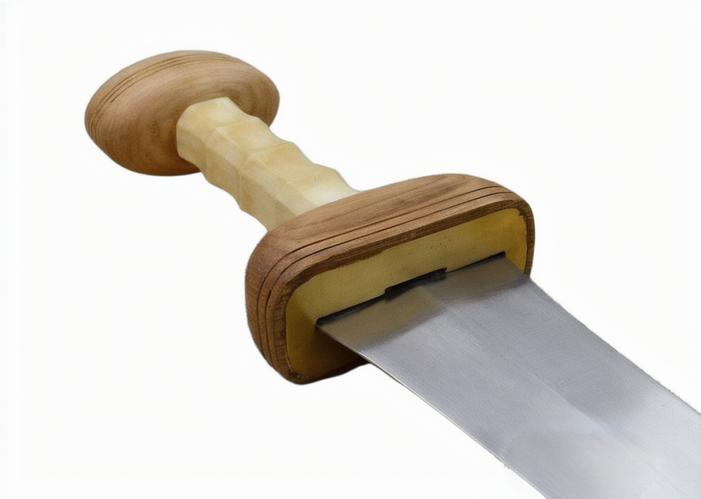 The Roman Mainz Gladius has a blade of high carbon steel and a hilt of wood with a grip of bone. The pommel nut is brass and the inlaid guard plate is likewise of brass. A protective felt tab is fitted atop the guard, it can be removed if needed.