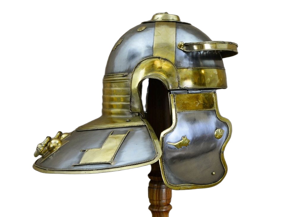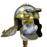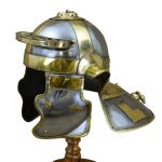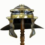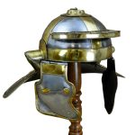 This Roman Niedermoermter Helmet is of 3rd century BC. Made by Deepeeka, this helmet is an almost exact replica of based off historical research and designs. This style of helmet with hinged cheek pieces and a large neck protection was found in the river Rhine and can now be viewed in the Mainz museum. Origins of this helmet date back to about 100 ad.