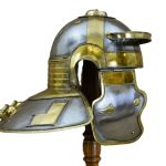 This Roman Niedermoermter Helmet is constructed from 18 gauge steel and brass accenting. The cheekplates are hinged and fitted with small rings to tie a chin strap onto (chin strap not included.)