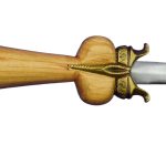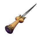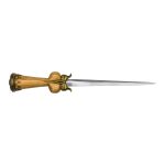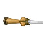 This dagger is reproduced from a historical late Medieval dagger from Northern Italy which is now kept within the Rothenburg collection in Germany. The piercing dagger blade is crafted from high carbon steel and the hilt is finely carved and polished wood. The pommel cap and guard plate are antiqued brass. Included is a sheath of high quality vegetable tanned leather which is completed with an antiqued brass pommel cap and an adjustable leather hanging cord.