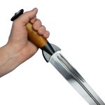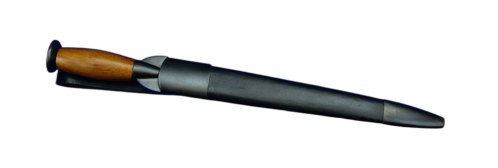 The Royal Scottish Dirk has a blade crafted from high carbon steel; the guard and pommel are blued steel and the grip is polished wood. The scabbard is of wood and overlaid leather with a blued steel chape and locket. The belt loop is of leather.