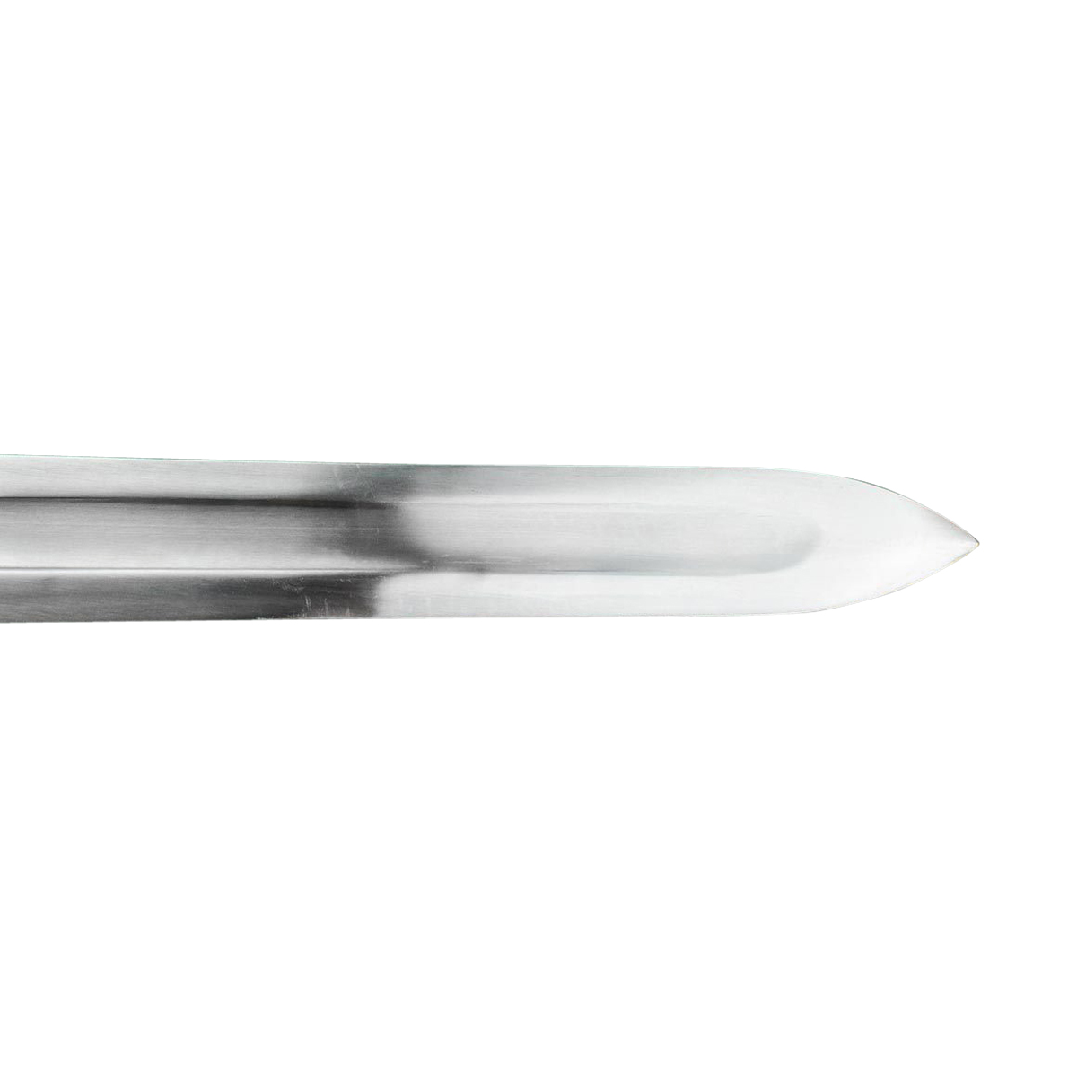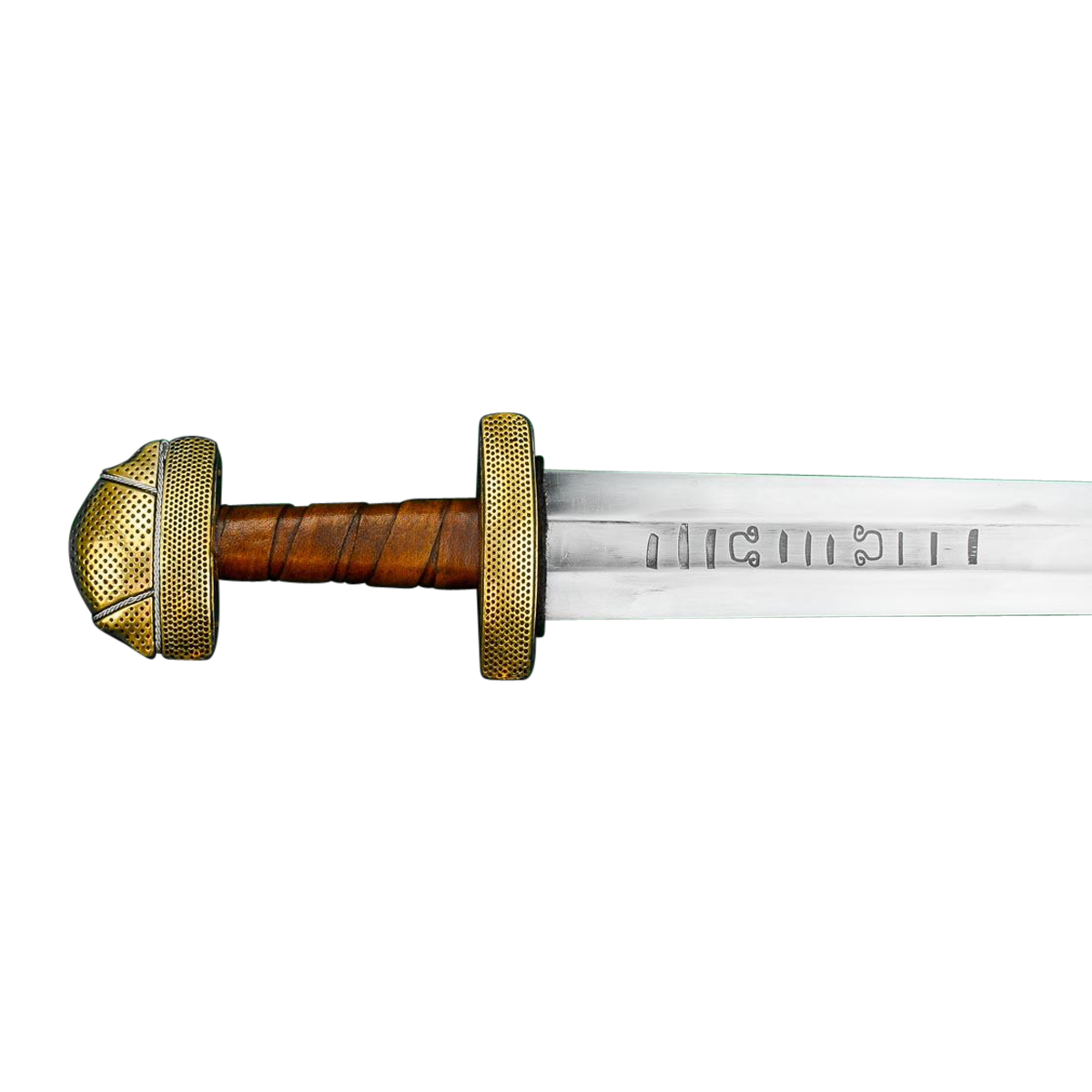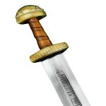 This Viking Sword has a blade of high carbon steel with a 48-52 HRc tempered hardness. The hilt is brass and the grip is wood with a wrap of leather. The sword is securely fitted into the hilt over the base of the two part pommel which was then capped over with the second half of the pommel and then secured with two rivets. The grip is wood with a leather wrap.
