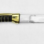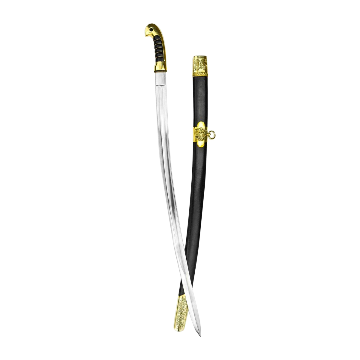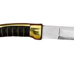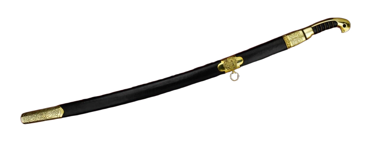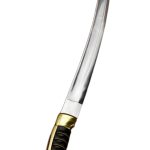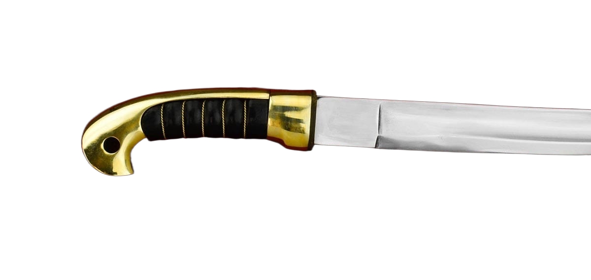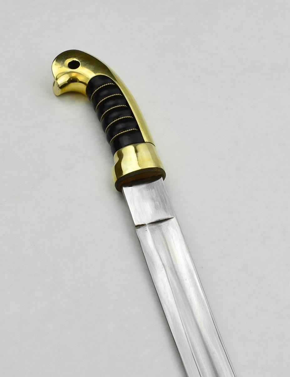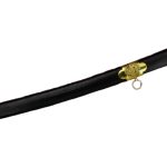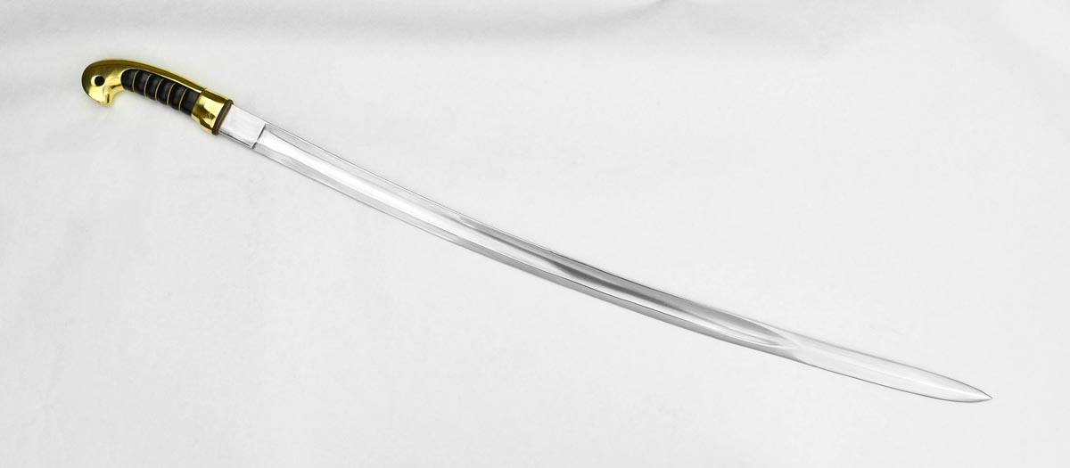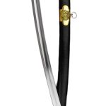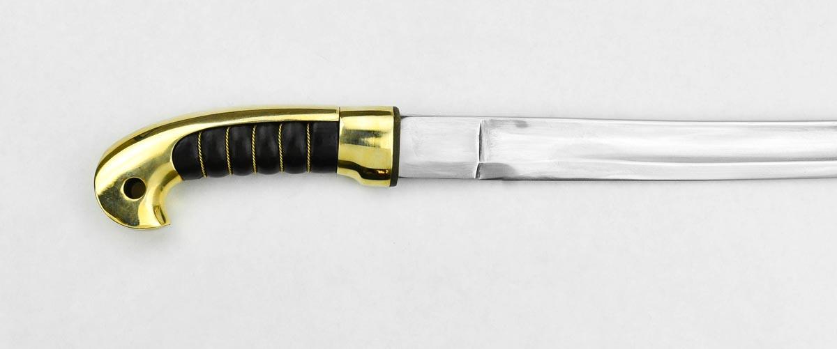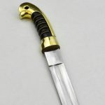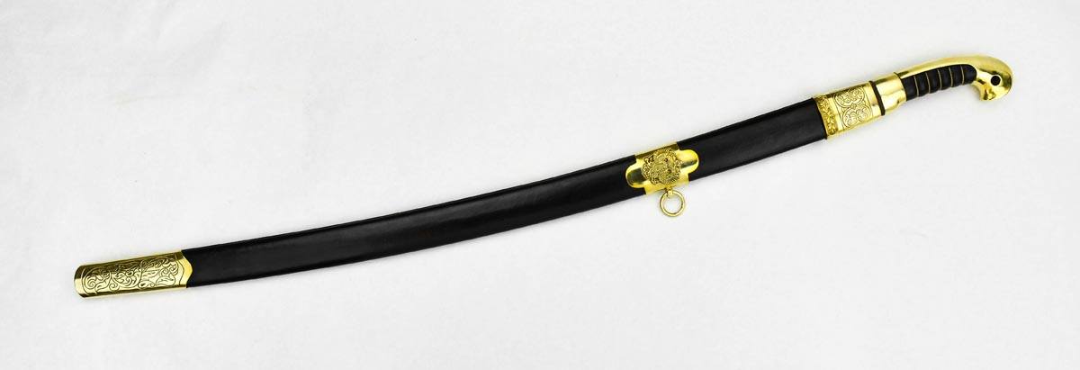 This Russian Imperial Officer’s Shashka has a blade of tempered 1055 high carbon steel which is matched with a brass hilt and a wood grip which is completed with a leather wrap and inlaid twisted brass wire.