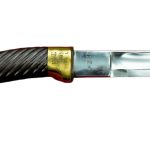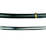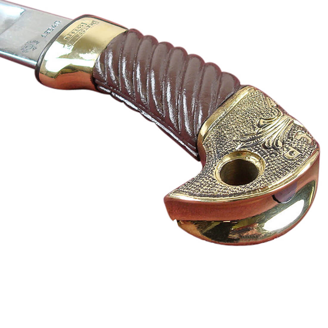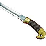 The blade is of tempered carbon steel with a deep fuller. The hilt and scabbard accents are of brass and the grip is of painted carved wood. The scabbard is wood-core covered in black leather. The Shaska is typically worn edge-side up, like a katana.