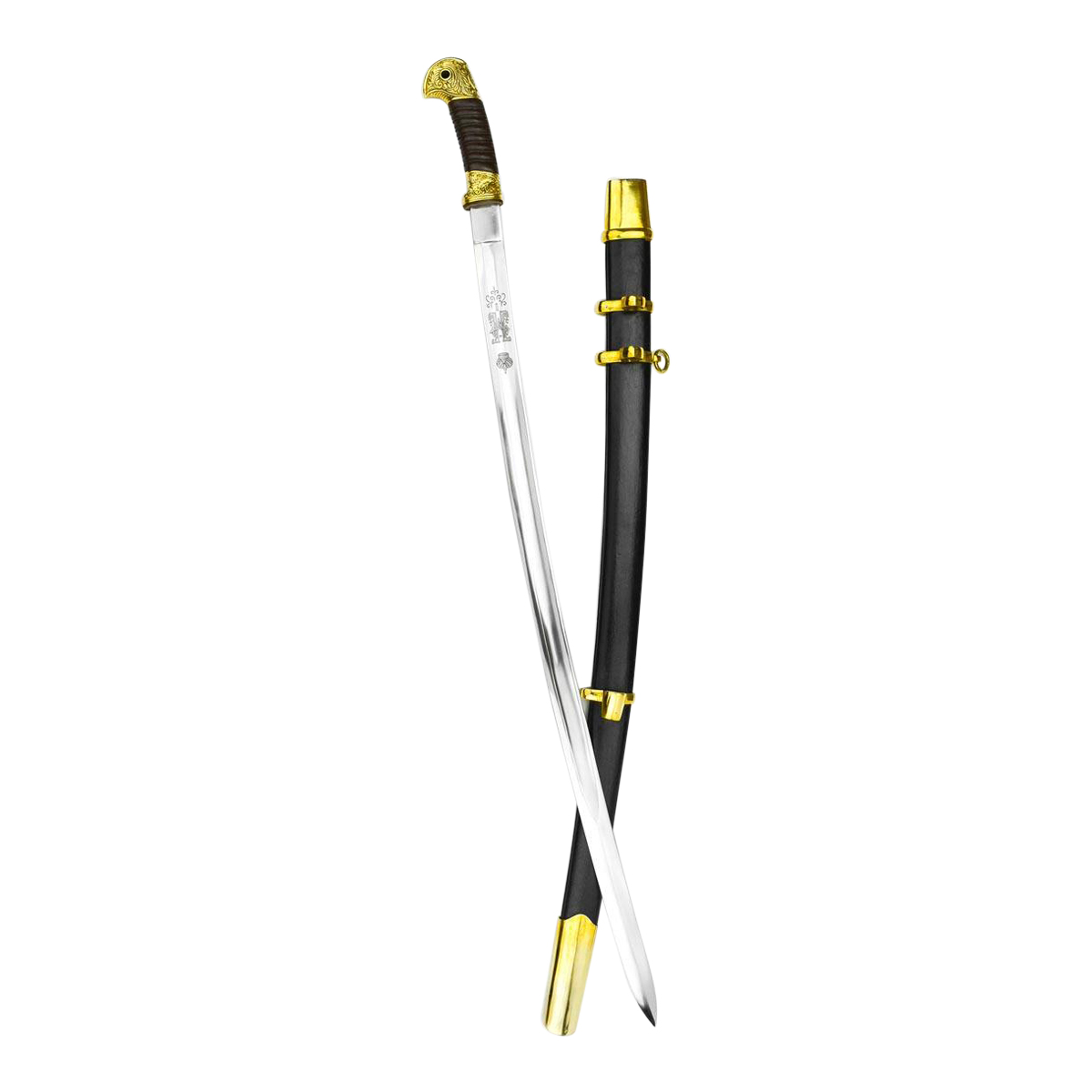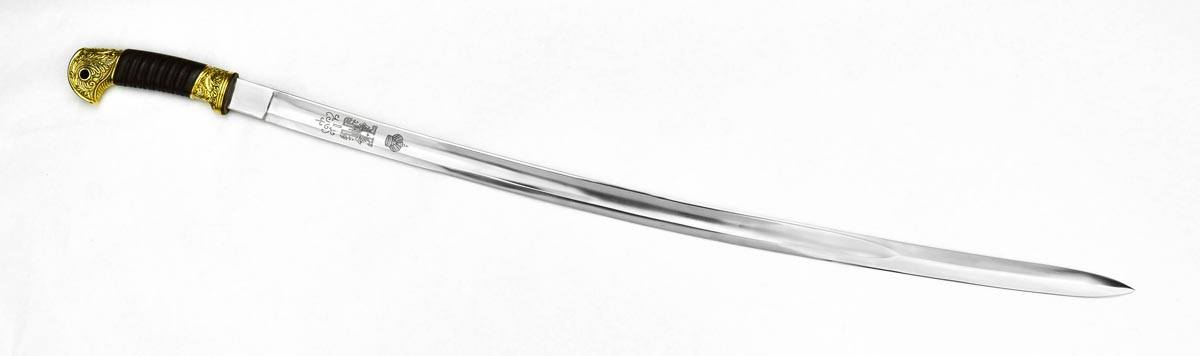 This Russian Tsarist Shashka saber has Imperial Russian symbols and regalia etched on both sides of the blade. The blade itself is crafted from tempered 1055 high carbon steel. The hilt has a guard and pommel of detailed cast brass and the grip is carved wood.