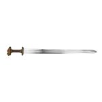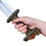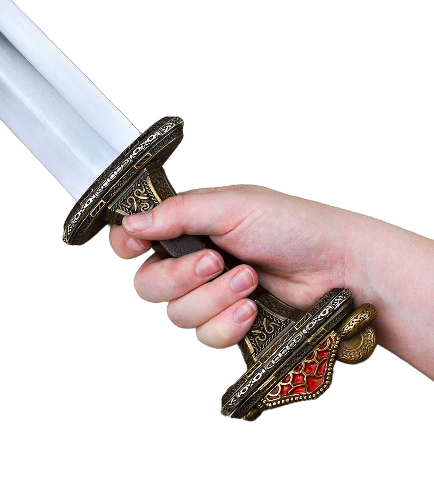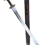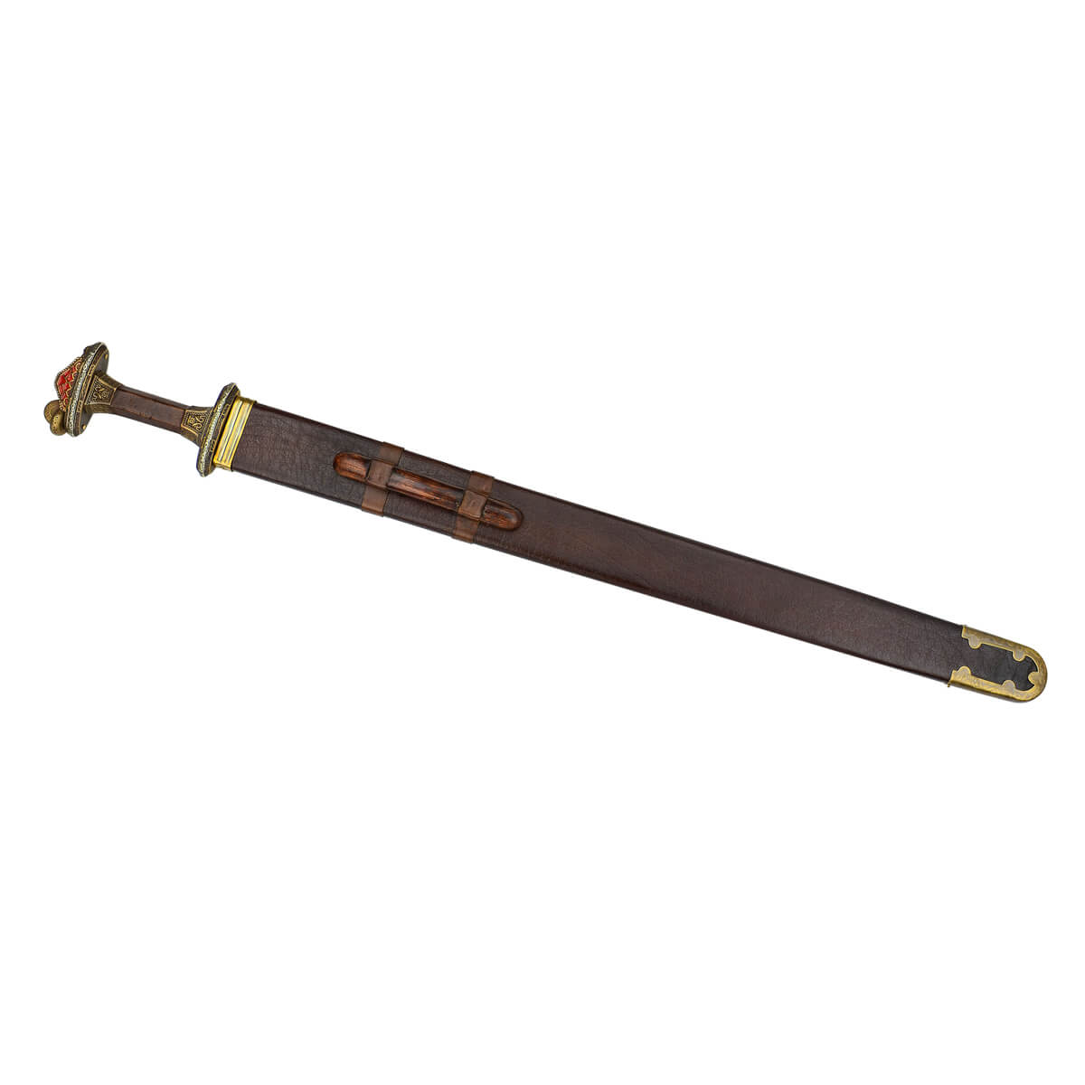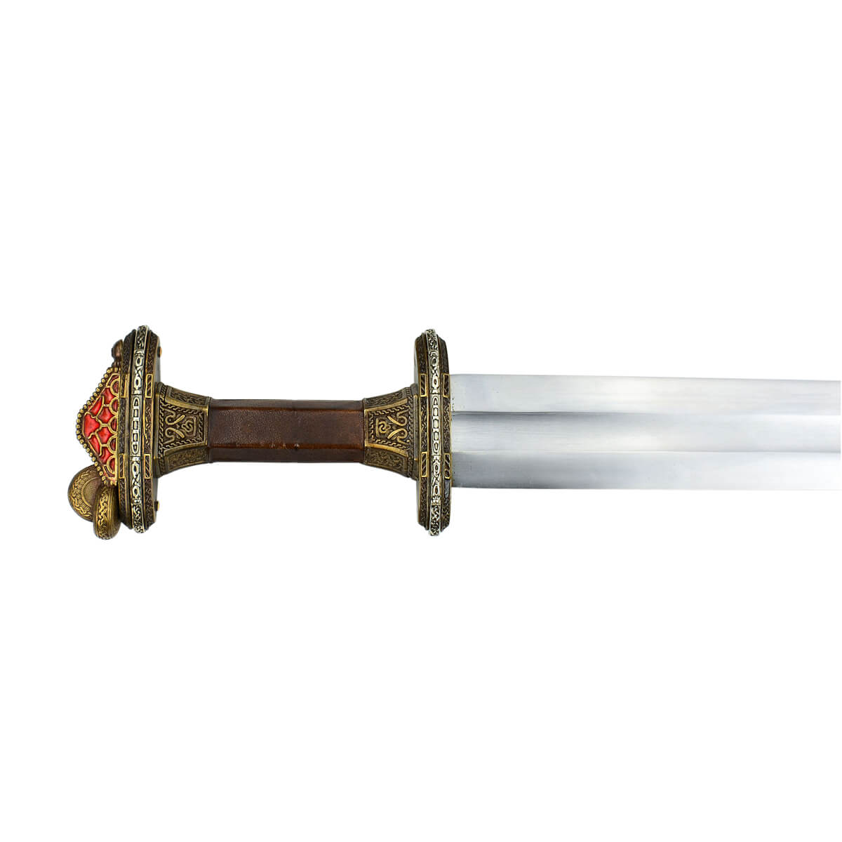 This Scandinavian Vendel Chieftains sword has a blade of tempered high carbon steel which is securely anchored into a highly detailed hilt with finely cast components of antiqued brass with tin-plated brass banded accenting. The grip is leather over hardwood and the pommel is inlaid with vibrant red enamel to recreate the red garnet gemstones of originals. Like many originals the pommel is a two-part construction which is completed with a riveted cap over the secured blade tang. This sword is in the style of examples which have a stylized pommel ring – a symbolic form used in lieu of a free-moving ring which was more common to earlier styles.