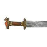 The finely detailed guard and pommel of the hilt are made from quality-cast brass with an antiqued finish and these components are completed with contrasting bands of tin-plated brass for a silver-like contrast. Historically, tin was a prized decorative element for swords such as this due to its relative scarcity and resemblance to silver. The grip is made from hardwood and the blade is durably anchored into the hilt. Like originals, the pommel is a two-part construction created by riveting a pommel cap over the pommel base. Red enamel is inlaid into the pommel to give it a blaze of scarlet color as seen on the preserved swords of champions, nobles and chieftains.
