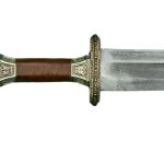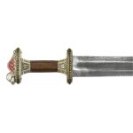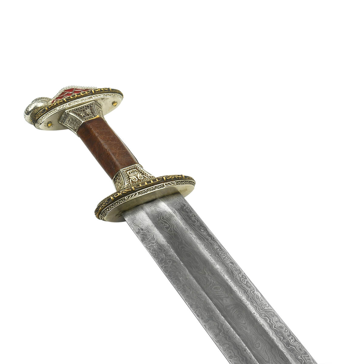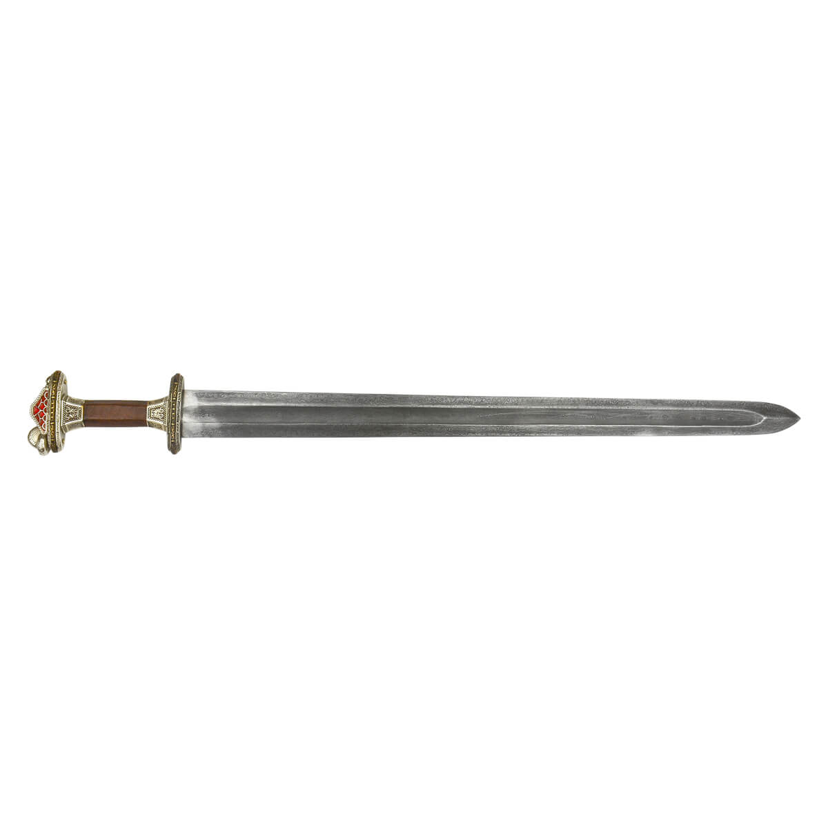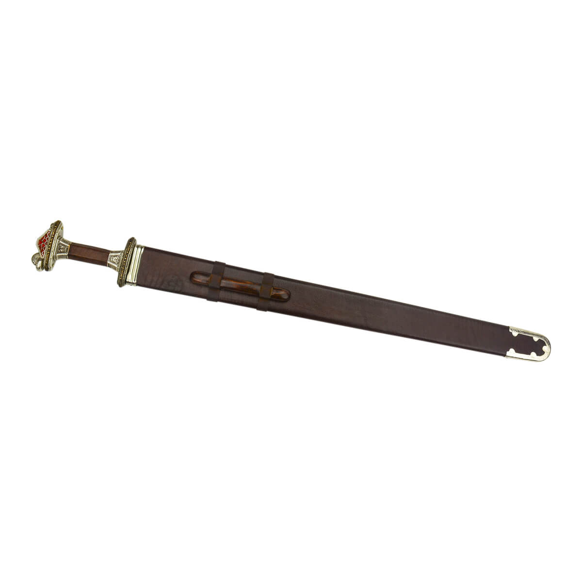 The finely detailed guard and pommel of the hilt are made from quality-cast brass with a tin plated finish and these components are completed with contrasting bands of antiqued brass for contrast. Historically, tin was a prized decorative element for swords such as this due to its relative scarcity and resemblance to silver. The grip is made from hardwood and the blade is durably anchored into the hilt. Like originals, the pommel is a two-part construction created by riveting a pommel cap over the pommel base. Red enamel is inlaid into the pommel to give it a blaze of scarlet color as seen on the preserved swords of champions, nobles and chieftains.