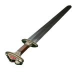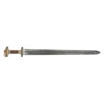 This 8th Century Scandinavian Vendel Sword has a blade which is skillfully forged from Damascus steel and its brilliant and ripple-like patterning was created when several different steels were forged together into a single blade. Original swords of this type were usually created with pattern welded blades which, like damascus, were forged by melding together several different steels into a single blade in a process which left visible patterning on the blade surface.