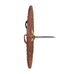 All the romance of the Scottish Highlands is expertly captured in this authentic targe. Originally used for battle and now mainly for decoration, this rugged shield is made of a dense hardwood and expertly covered with soft leather. An historical design using both brass fittings and tacks have been added for additional beauty. Dual leather straps in the back and a deadly spike which protrudes out the front.