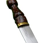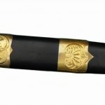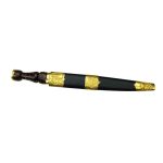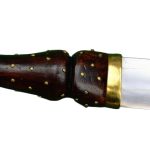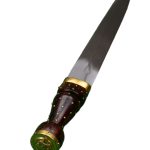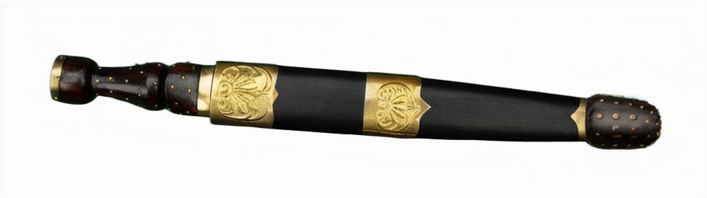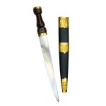 This Scottish Dirk has a high carbon steel blade and its hilt is of wood and brass. The wood-core scabbard is overlaid in leather and finished with brass accents.