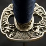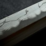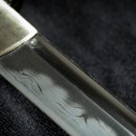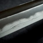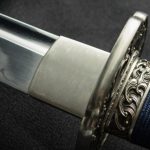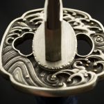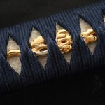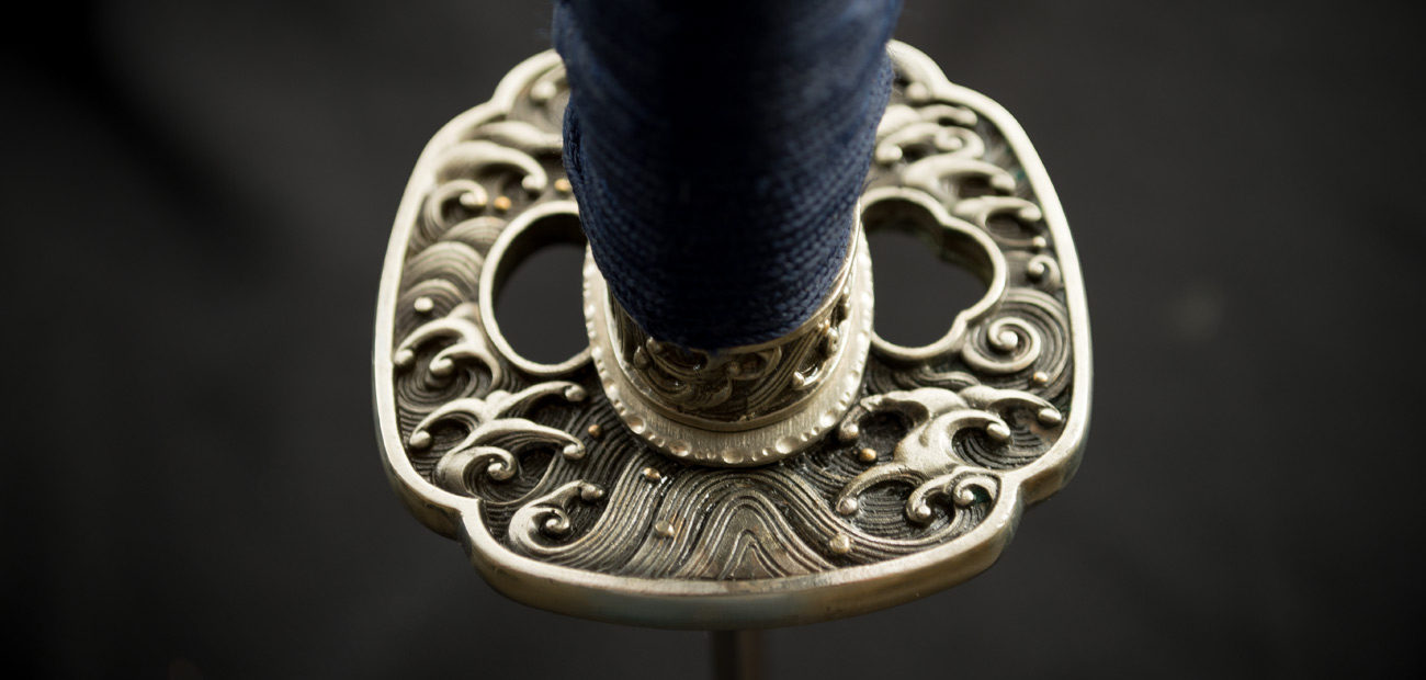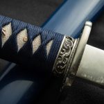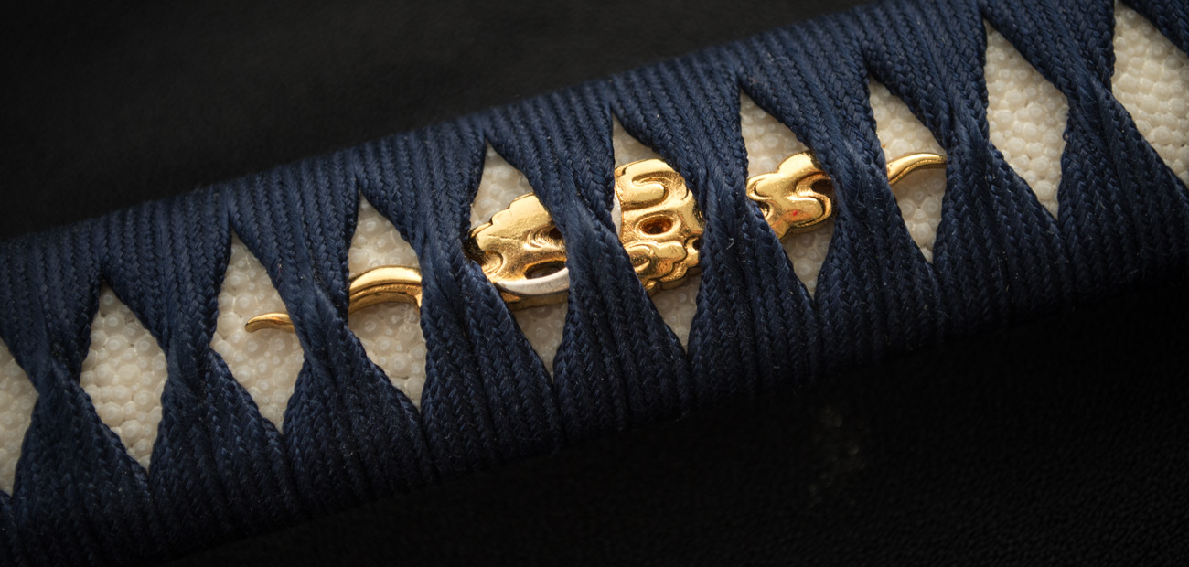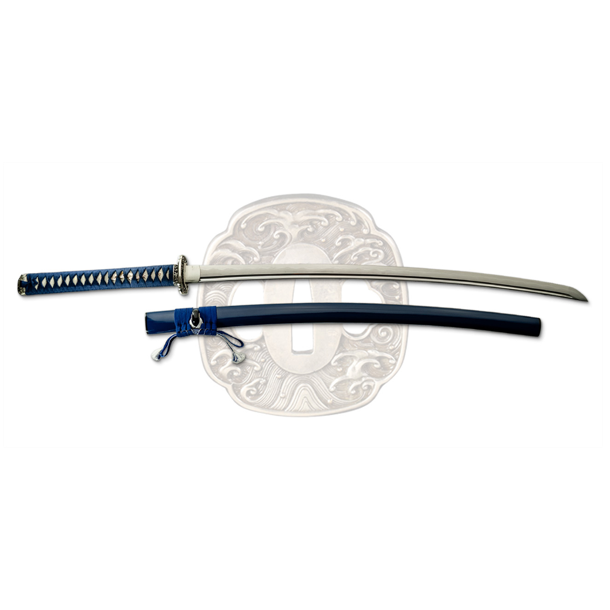 The placid blue saya conceals a rippling folded steel blade featuring bo-hi (groove) collared by a silver hibaki and notched seppa. The hada and hamon mirror the silver turbulent waves depicted tsuba, kashira and fuchi. Silver and gold menuki contrast against the dark blue tsuka handle wrap overlaid white same (ray skin). A blue and white sageo complete the saya accented by buffalo horn kurikata and koiguchi. The Sea Wave Katana & Wakizashi feature another duality between being formidable weapons and works of art.
