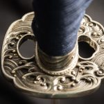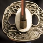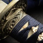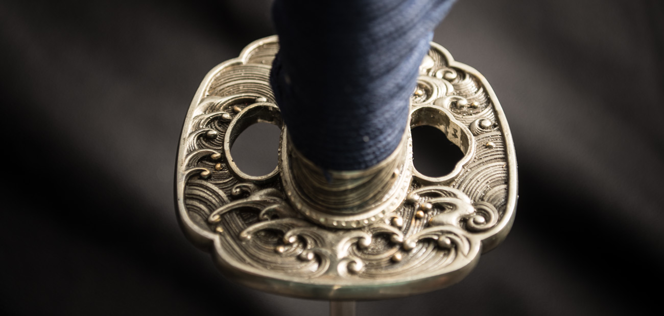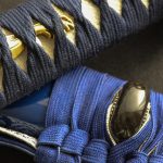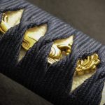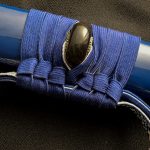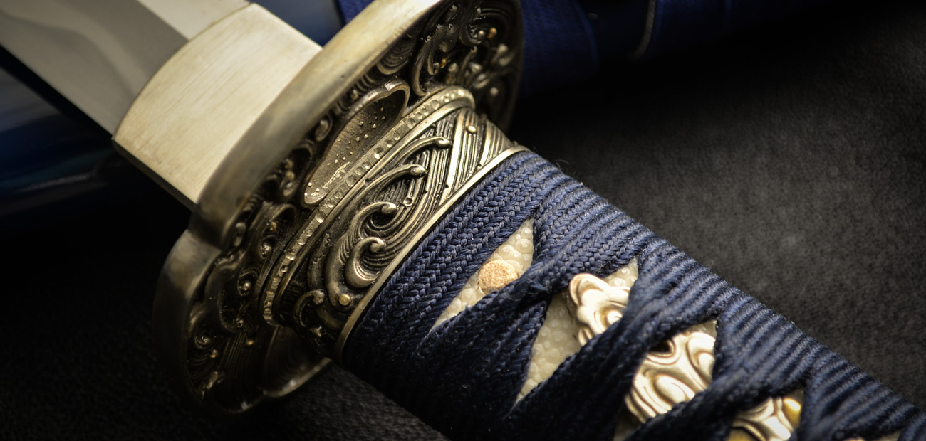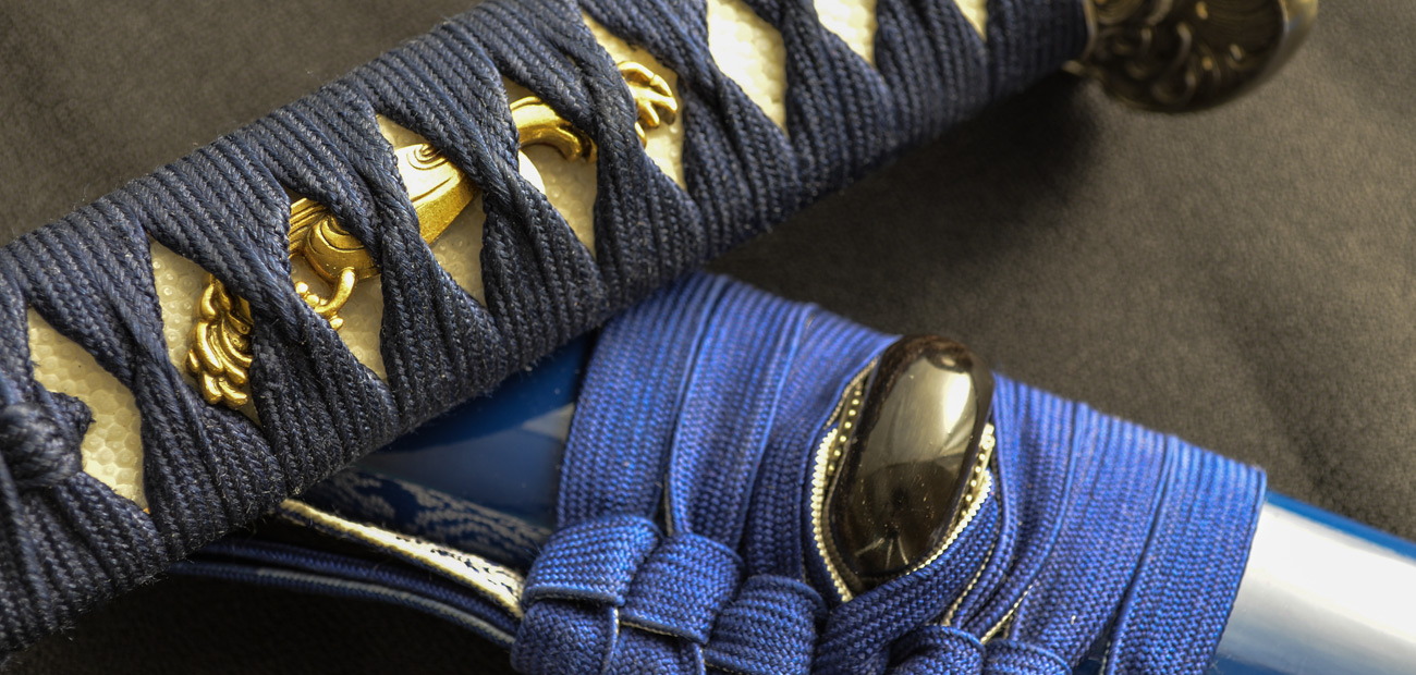 The placid blue saya conceals a rippling folded steel blade featuring bo-hi (groove) collared by a silver hibaki and notched seppa. The hada and hamon mirror the silver turbulent waves depicted tsuba, kashira and fuchi. Silver and gold menuki contrast against the dark blue tsuka handle wrap overlaid white same (ray skin). A blue and white sageo complete the saya accented by buffalo horn kurikata and koiguchi. The Sea Wave Katana & Wakizashi feature another duality between being formidable weapons and works of art.