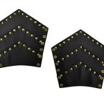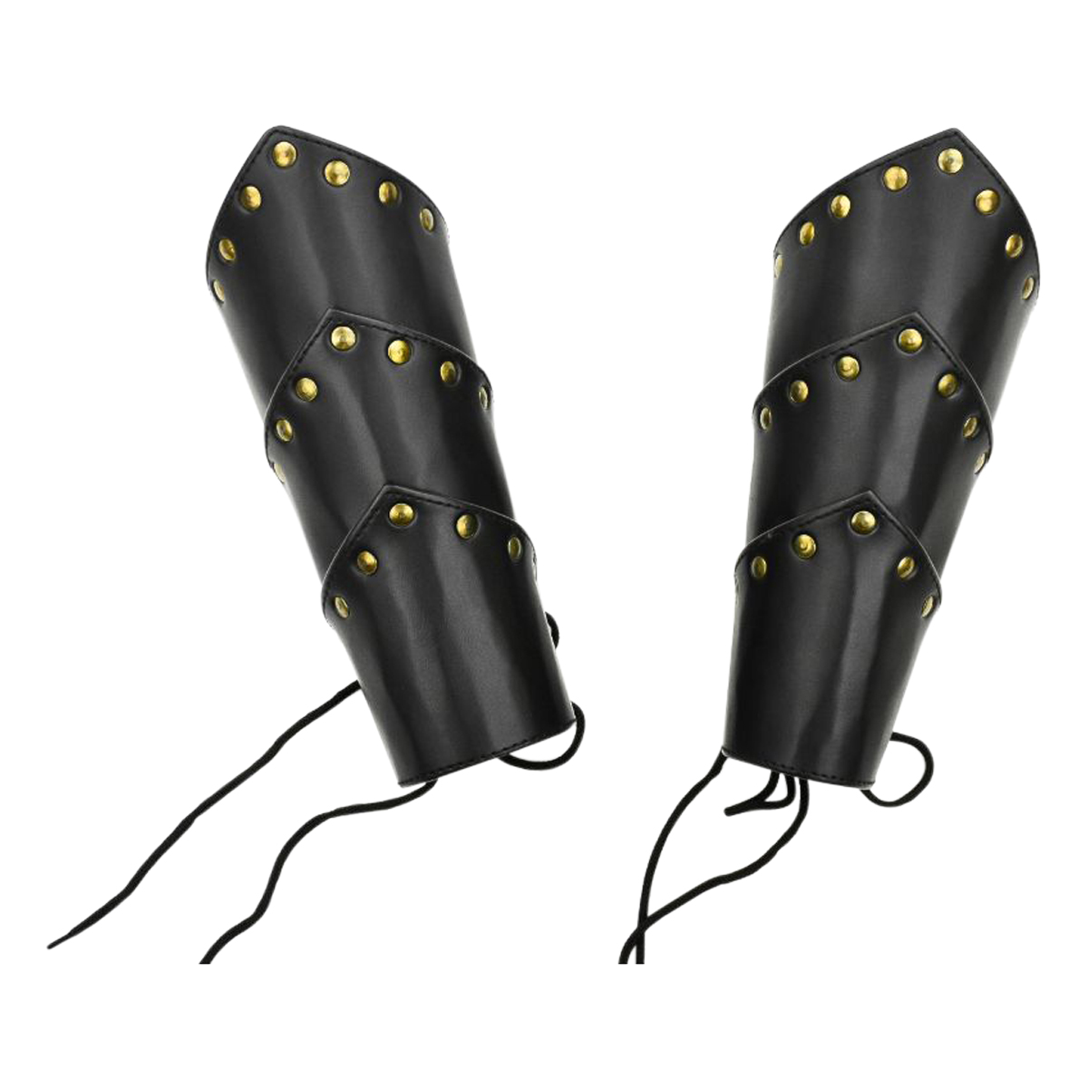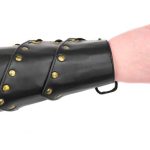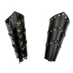 This matched pair of leather bracers are made from thick and high quality leather which is completed with antiqued brass studding and eyelets for a bold appearance. Cord for lacing them onto the forearms is included.