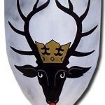 This battle-ready Deer Shield is made of 16 gauge thick steel which will protect you from poundings in reenactments and tournaments. This SCA shield comes with a choice of two 1 1/2 inch genuine thick leather straps already attached so you can use it right out of the box (extra charge) or a wall hanging chain. This Deer combat shield is a unique piece and will stand out on the field of battle.