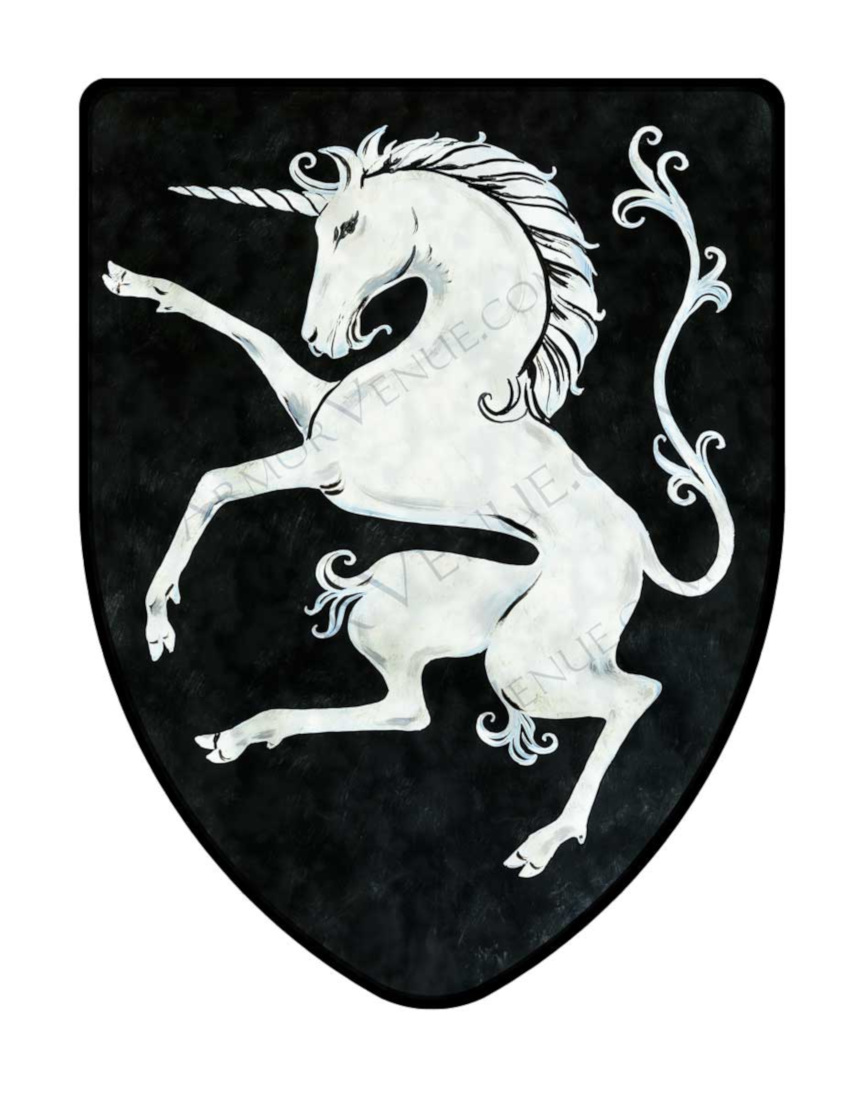 This battle-ready Prancing Unicorn Shield is made of 16 gauge thick steel which will protect you from poundings in reenactments and tournaments. This SCA shield comes with a choice of two 1 1/2 inch genuine thick leather straps already attached so you can use it right out of the box (extra charge) or a wall hanging chain. This impressive Prancing Unicorn combat shield is a unique, one of a kind shield that is sure to stand out at your event.