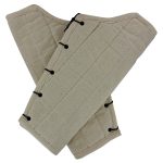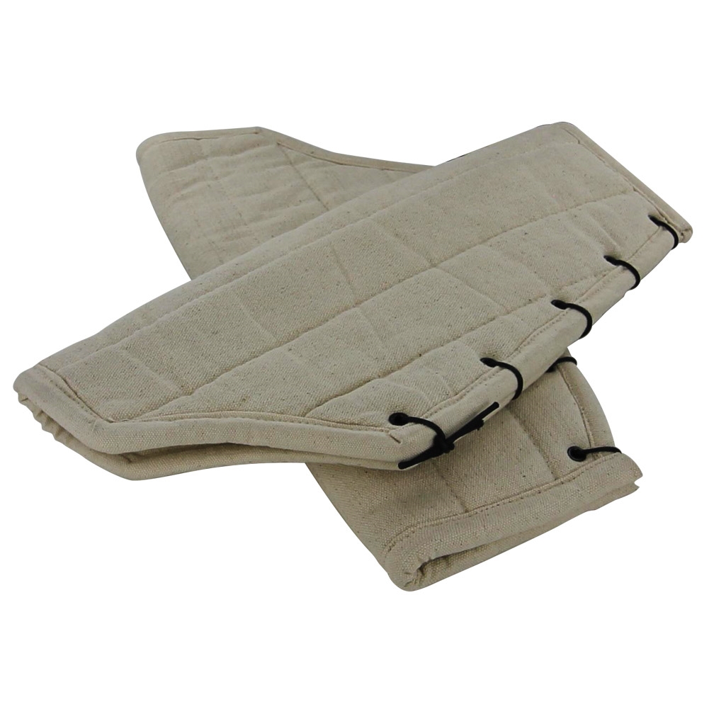 The primary purpose of greaves is to protect the tibia from attack. The tibia is a bone very close to the skin, and is therefore extremely vulnerable to just about any kind of attack. A blow to this region would render this leg useless there making the solider vulnerable. In addition to added protection for the shin the padded greaves cushion the leg from chaffing and irritation of metal armor. This set is made to last being constructed of cotton with a durable ecru canvas exterior this item is quality at its best. The closure is adjustable with steel eyelets and a cotton lace. The Shock Charge Medieval Padded Greaves Armor is a must have under a full set or partial set of metal armor. The standard size greaves fit almost all and dry cleaning is recommended.