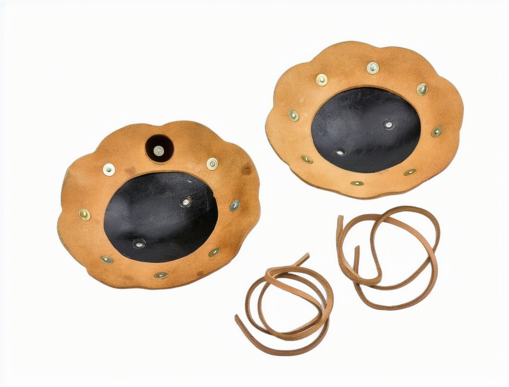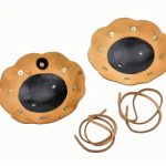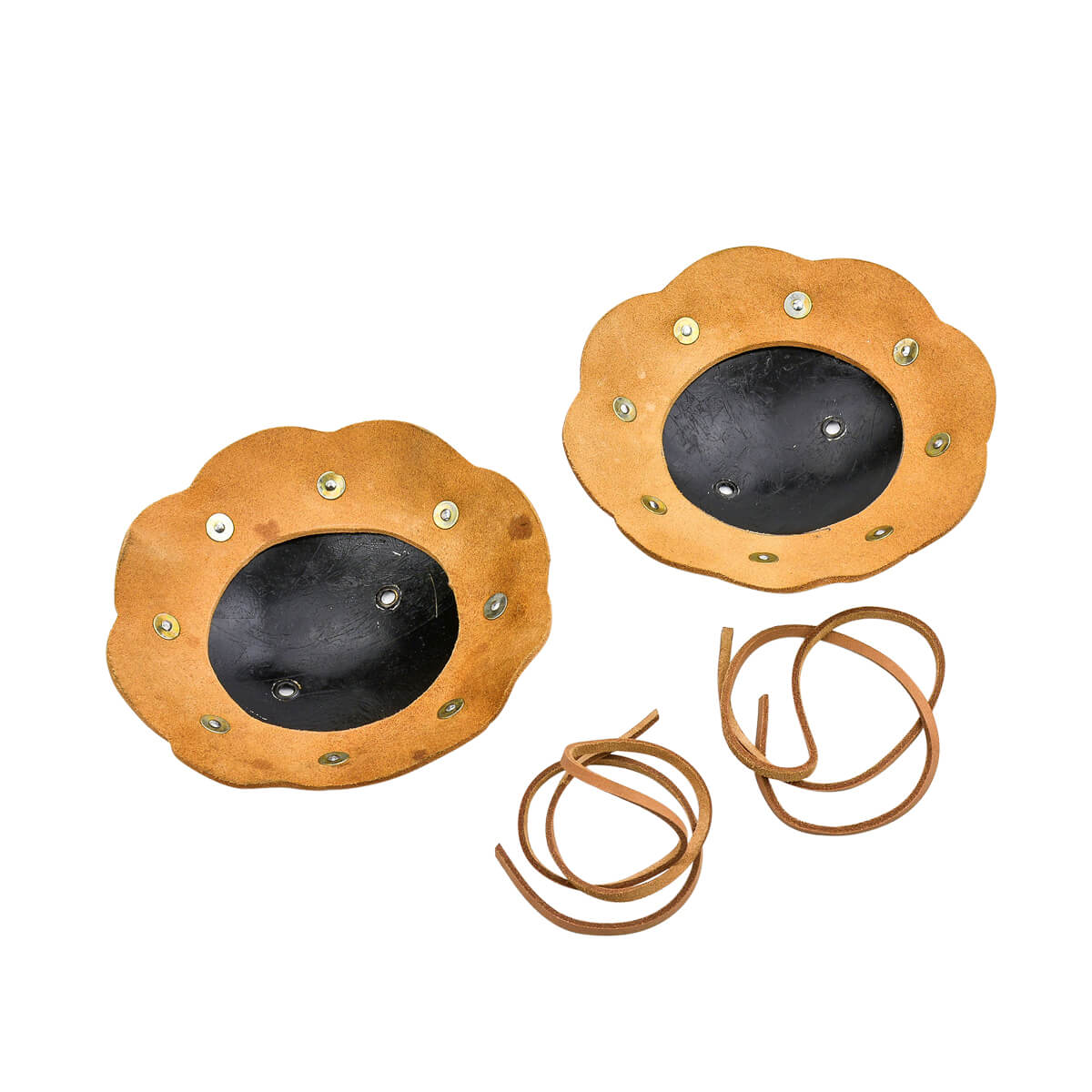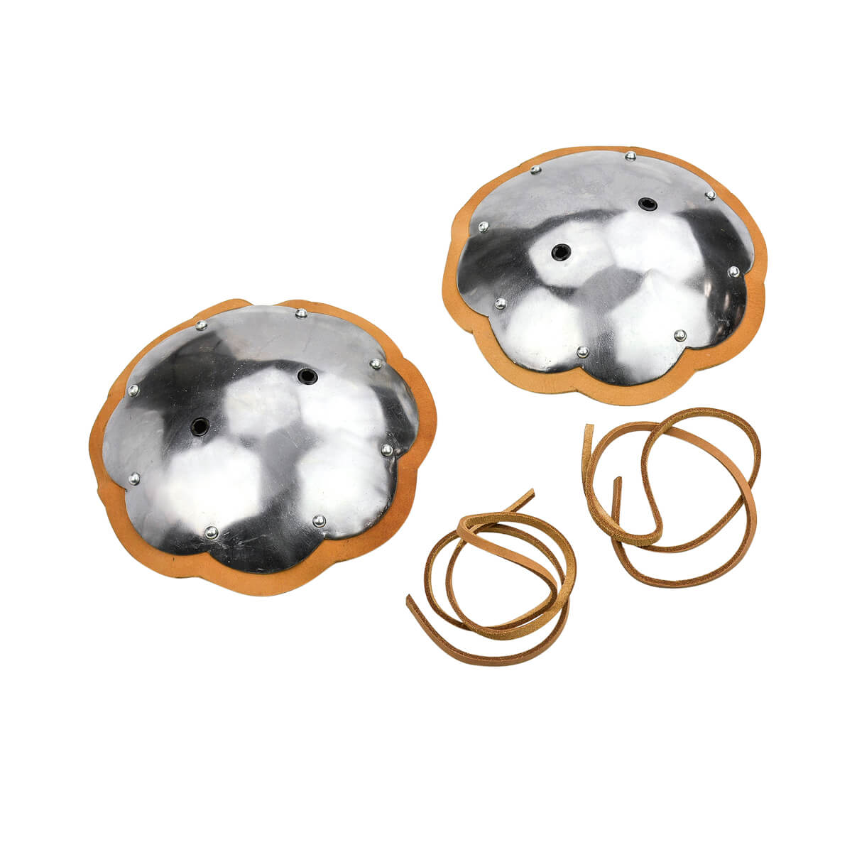 The Rondells are constructed from 16 gauge steel and edged in thick 6-7 oz leather to provide chafe protection. The leather is solidly riveted into position. Leather cords for fastening the armor is included.