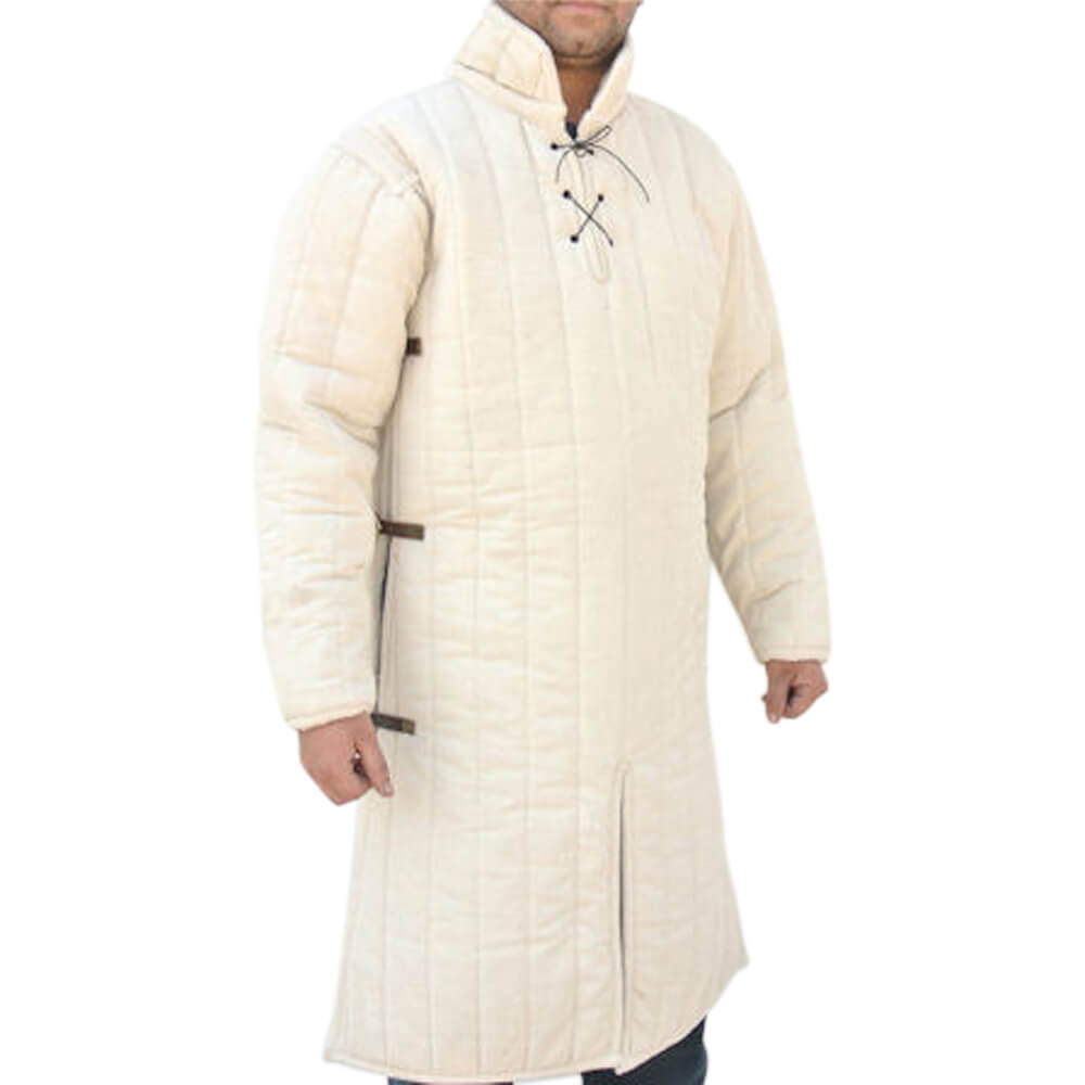 Maximize your comfort and protection with the Side-Buckled Gambeson (Natural). With an authentic look, this garment is crafted from durable, quilted cotton with organic cotton felt padding on the interior. Further enhancement comes from brass buckles and straps which secure on the side. This gambeson is both pleasant to the touch and stylish and is great for costumes and re-enactments.