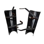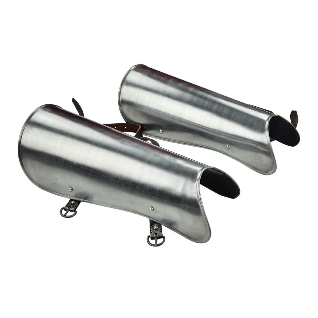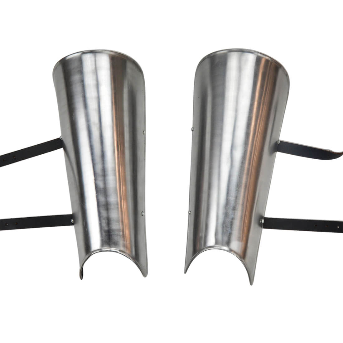 These simple greaves are constructed from 18 gauge steel and are buckled to the leg with a set of leather straps and adjustable steel buckles. These greaves are larger than most and will fit most leg sizes or they can even fit around some leg padding.