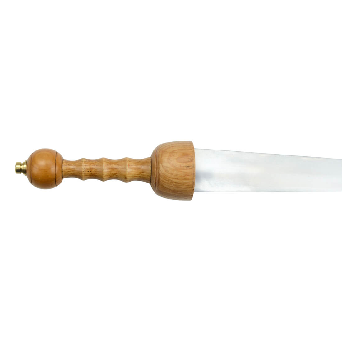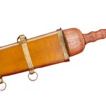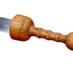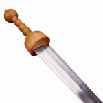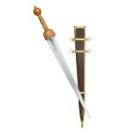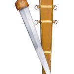 A unique Gladius, this sword has substituted the standard double-edged blade for a single-edged blade with a particularly acute tip and a thick spine. It is an ideal form for a rigid blade designed to pierce mail armor. The blade is of high carbon steel and it is mounted into a wooden hilt and finished with a brass pommel nut.