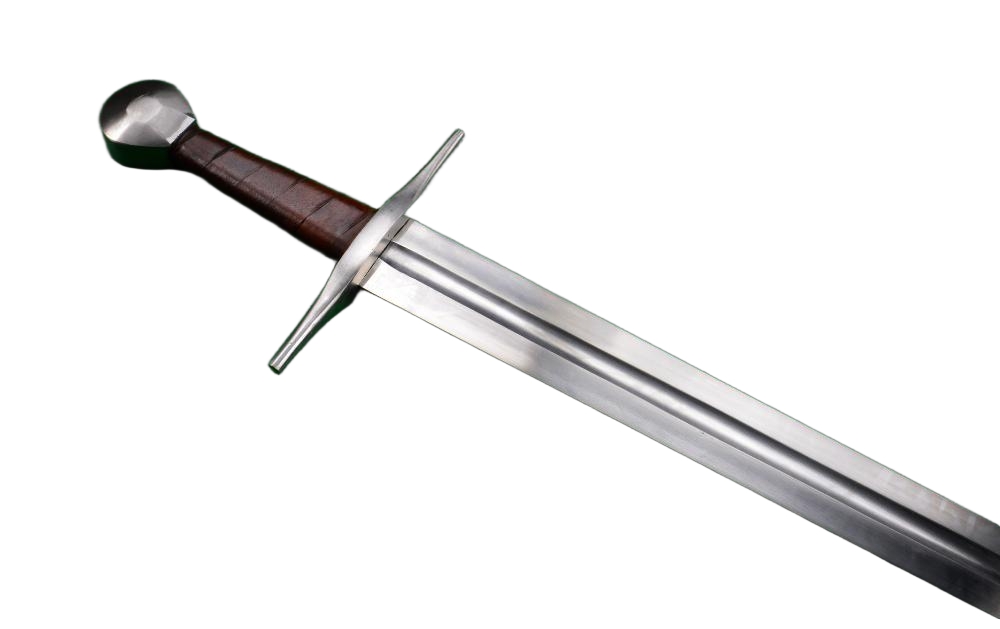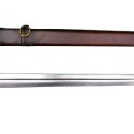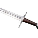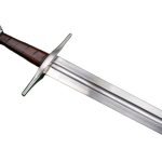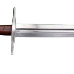 This version of the Sir Marshall Knight Sword has a blade that is crafted from high carbon steel – it is built with a thick blade with blunted edges that are at least 2 mm thick that is intended for stage and sport combat. The hilt is steel with a wooden grip that is overlaid in leather. The blade tang is solidly peened over the pommel to create a secure and strong hilt construction.