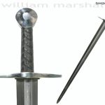 In honor of one of England’s finest and most faithful knights comes the Sir William Marshall Sword with Damascus Blade. This museum reproduction comes with either a high carbon steel blade or a folded, Sweedish powder steel blade. Featuring a central ridge fuller and full length distal taper, the blade is durable and provides excellent support. This piece also has a leather wrapped grip that comes laced and a solid guard and pommel. Also included is a leather wrapped scabbard with steel accents. This is truly a worthy addition to any collection.
