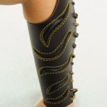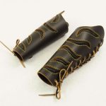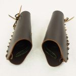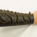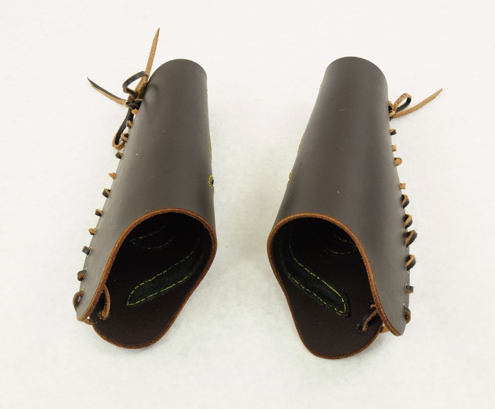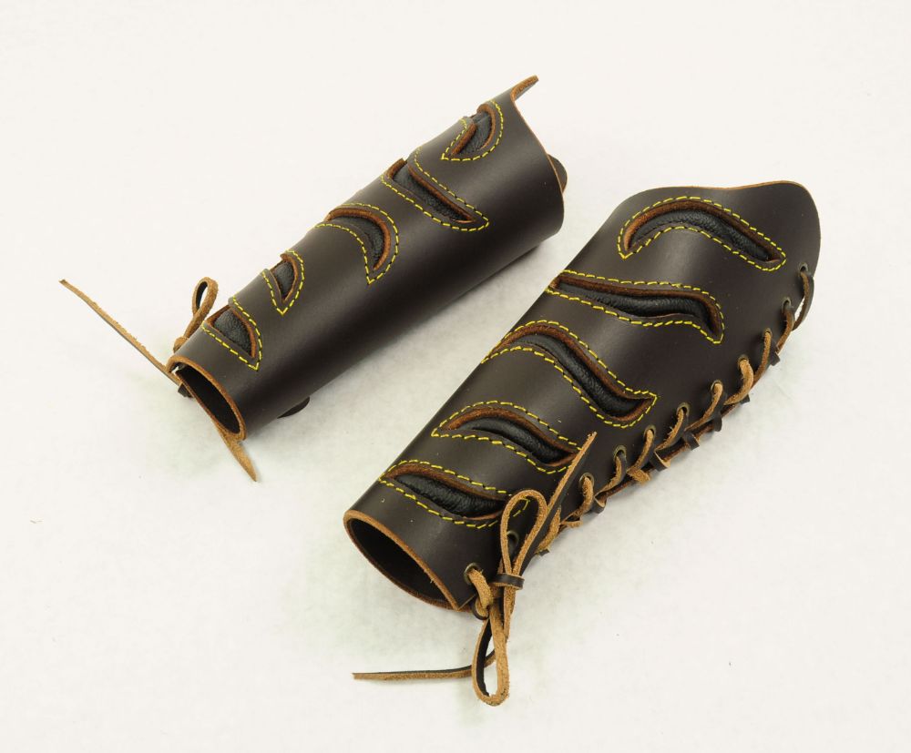 This pair of leather bracers is made from thick leather and are fitted upon the arm with a thick leather cords. The slashed cut-outs have a backing of softer black leather stitched into position.