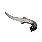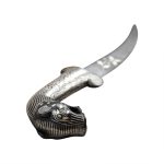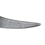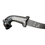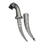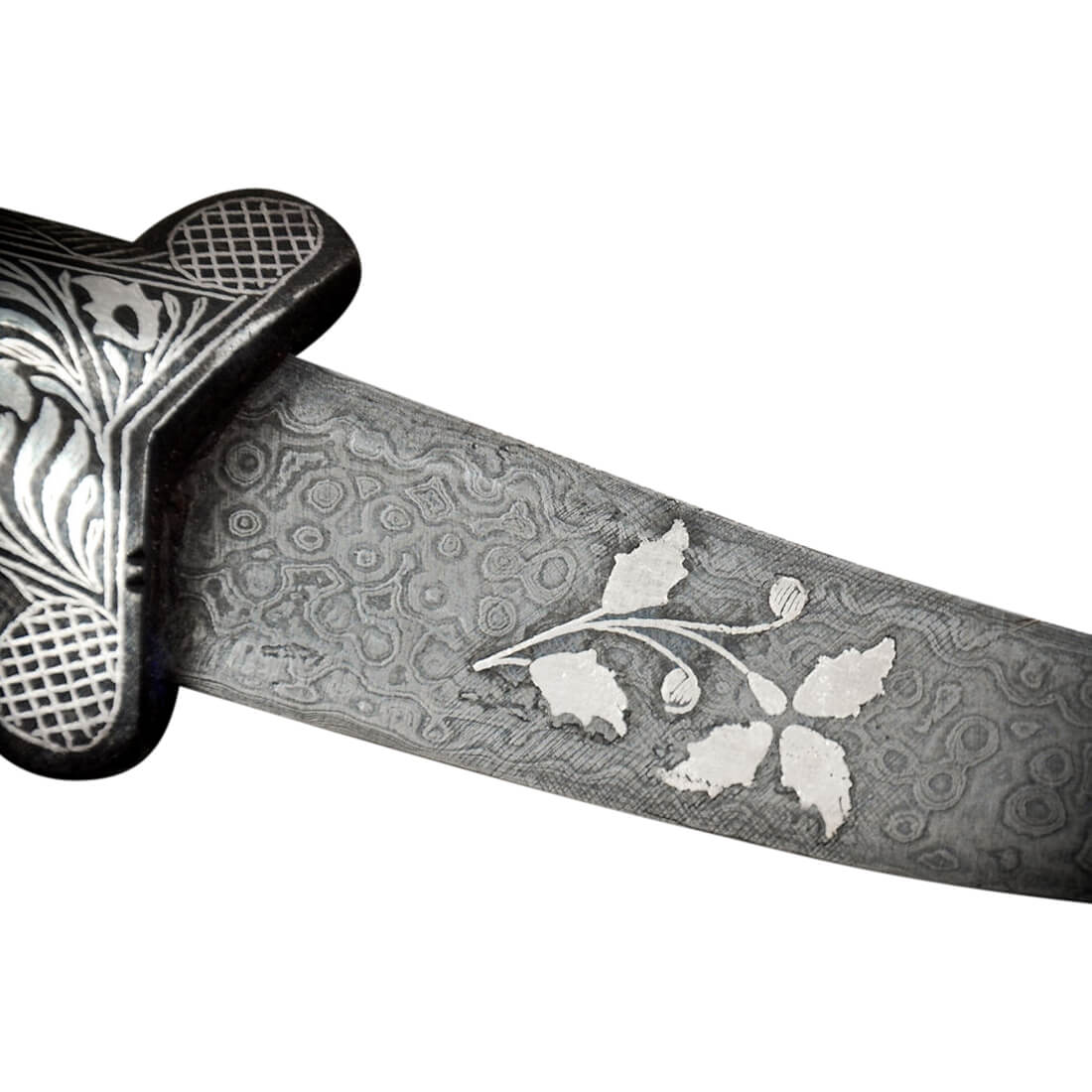 This handcrafted dagger from India is in itself a showcase of the traditional Indian bladesmithing arts; it has an unsharpened blade of damascus steel with an inlaid silver floret on a single side of the blade. The hilt is steel and it has been thoroughly embellished with koftgari inlay silver. The blade tang is fixed into the grip by completely filling the hilt with a hardened resin – this is a traditional method for hilting many edged weapons in India. The dagger is paired with a steel sheath of koftgari inlay – it is lined on the inside with velvet to cushion the blade and prevent scratching when drawing from the sheath.