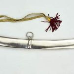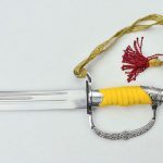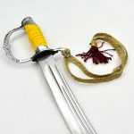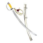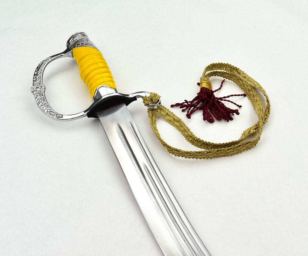 This Soviet Army Officers Sword has a blade of high carbon steel which is durably mounted to a hilt of chromed metal with embossed Red Army insignia. The grip is made of wood with a painted finish and the sword is completed with a sword knot of braided brocade. Included with the sword is a steel scabbard with steel hanging rings for wear.