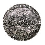 The Spanish Round Shield 16th Century by Marto of Toledo Spain is a replica reproduction of a round shield of the 16th century, dating back to the reign of Philip II of Spain and today displayed at the Real Armeria in Madrid. On the front of the shield is a battle scene, depicting Romans and Carthaginians during the second Punic war. Fabricated in polyurethane with amazing detail. Over dimensions are 17.5 inches.