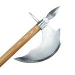This high carbon steel axe is festooned with extra bladed options in order to give the warrior bearing it plenty of options for defeating the foe; namely a back-spike and a spearhead. This axehead is pinned with screws to an extra-thick and durable wooden haft.