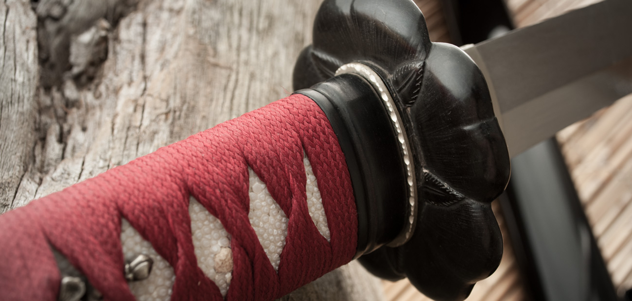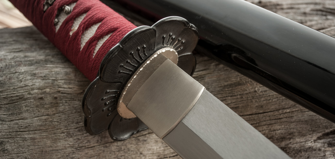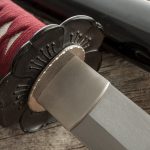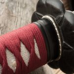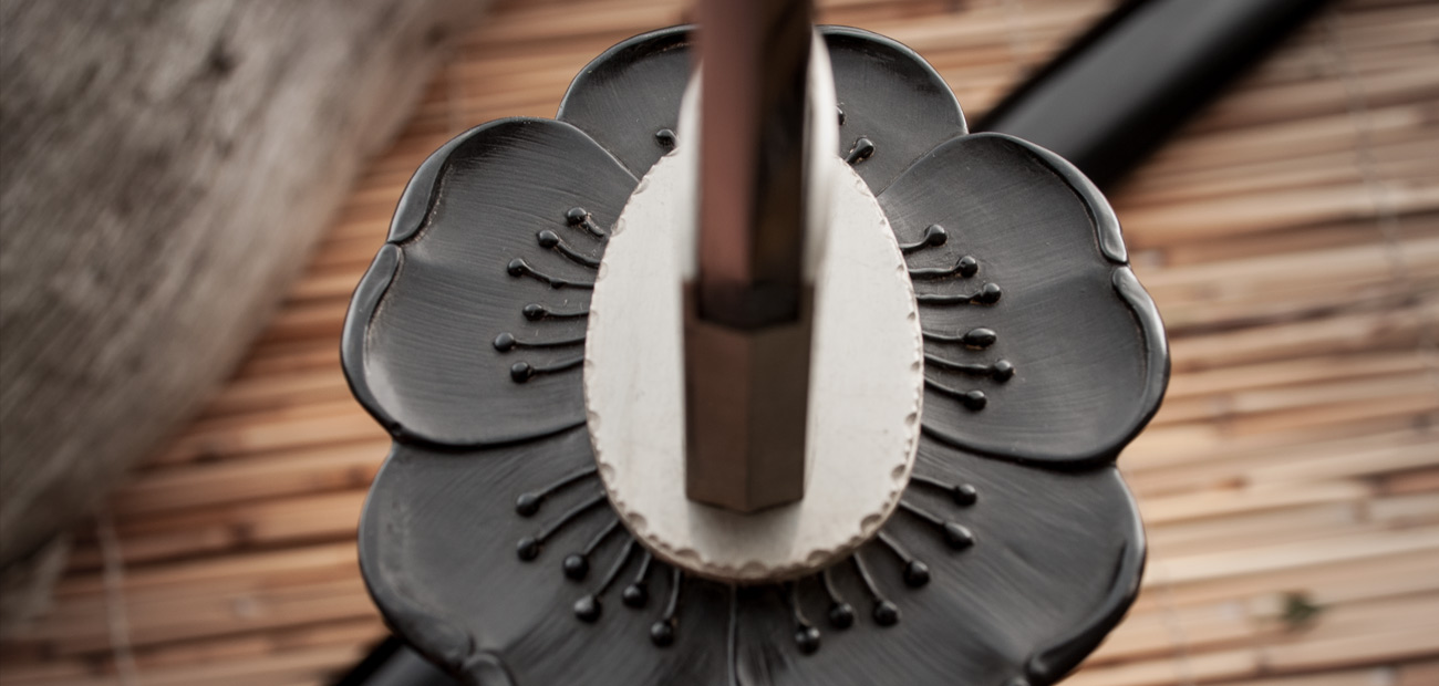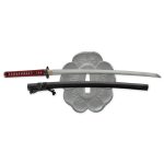 Contrasted only by the crimson tsuka-ito (handle wrap), same (ray skin) on the wood core handle, the notched seppa (spacers), silver habaki (blade collar) and cherry blossom menuki (handle ornaments) represent the only vivid aspects of this sobering piece. The black lacquered saya (scabbard) features a buffalo horn rimmed koiguchi (scabbard mouth) and wood kurikata (knob) and black sageo (cord).