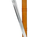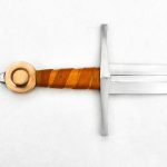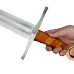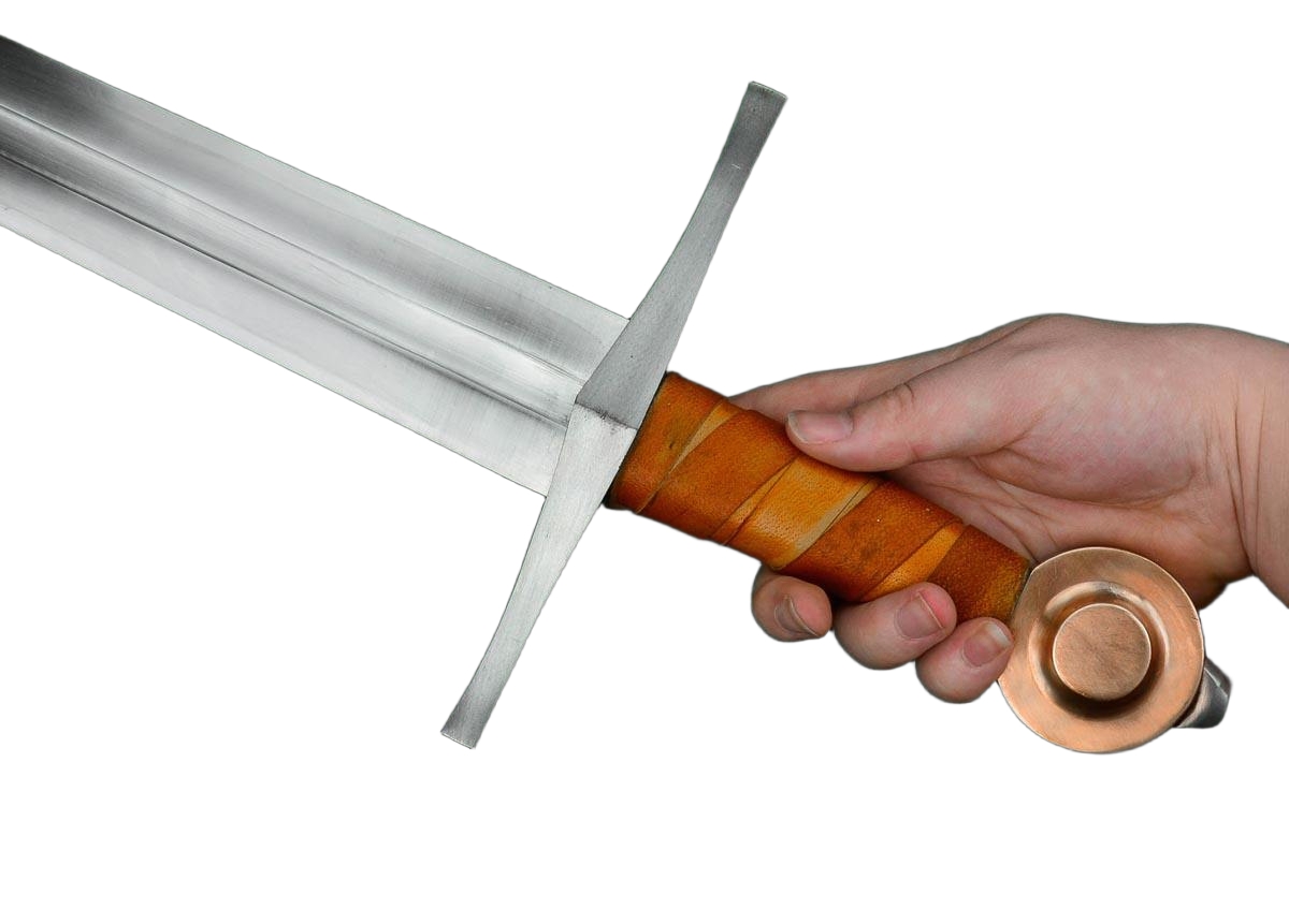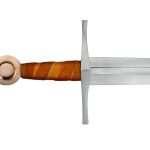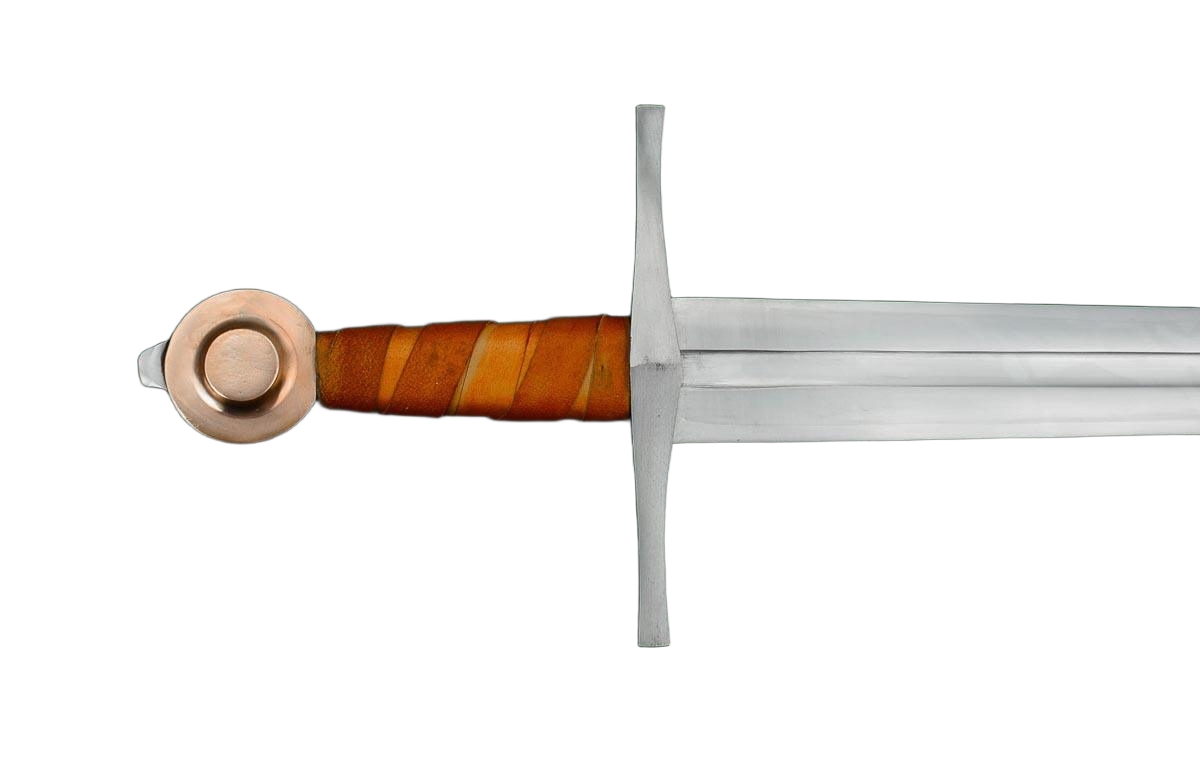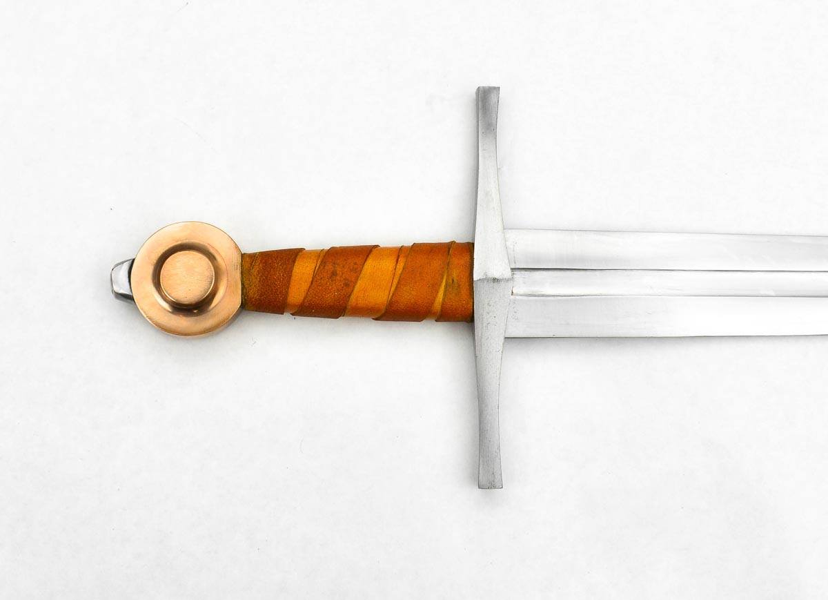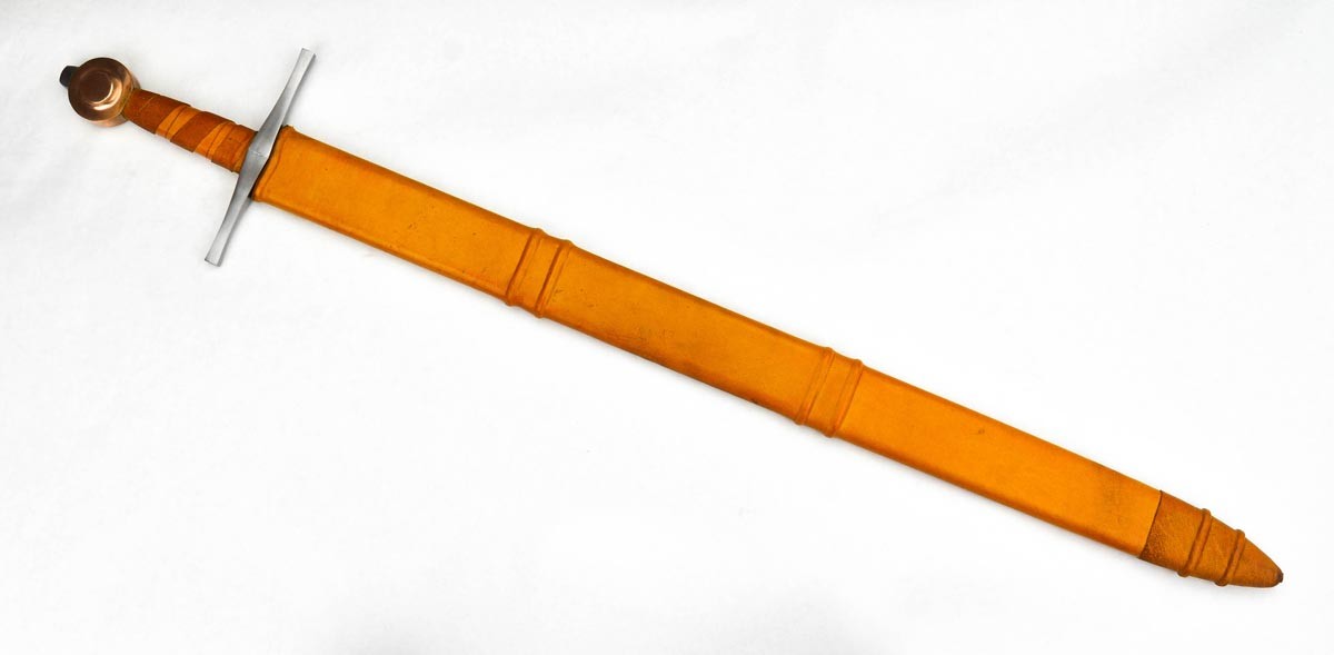 The St. Annen sword has a blade of high carbon steel. The hilt is a steel guard with a leather-covered grip of wood and a pommel of bronze. The sword tang is peened over the steel peen block on the pommel for a strong and lasting hilt construction. The scabbard is wood which is wrapped in leather.