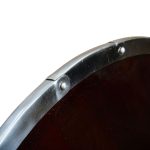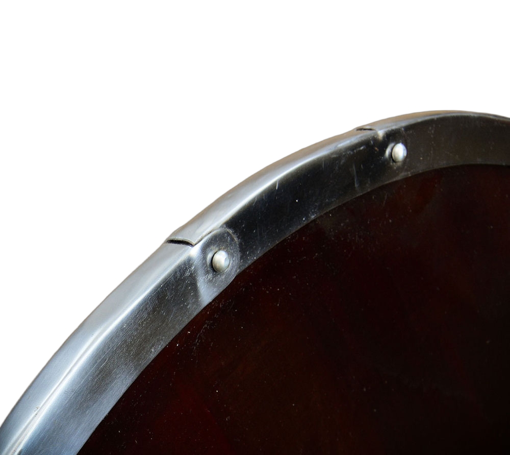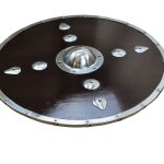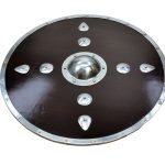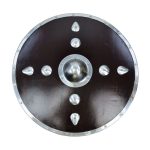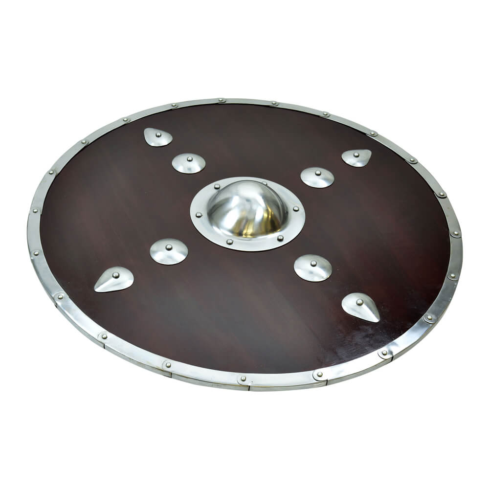 If you are looking for the perfect accessory to compliment your Viking ensemble, then the Studded Viking Shield is sure to please. Modeled after one a Viking warrior would have carried, this piece features solid wod construction with a dark stain and is highlighted by a riveted boss, large studs, and a steel rim. The reverse side is blackened and has a riveted wooden grip. With authentic design, this shield is impressive to behold and great for costumes, re-enactments, and display. 29 3/4” x 29 3/4”