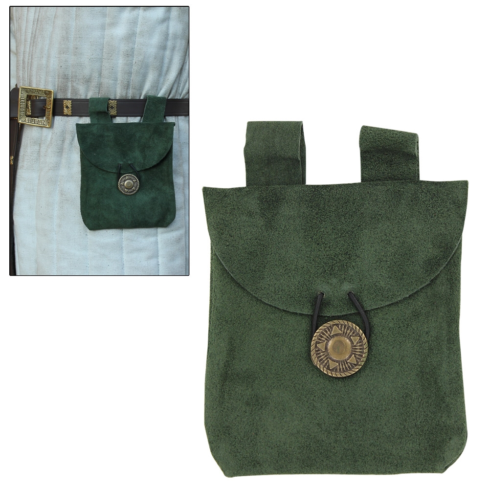 Whether you are at a Renaissance fair, the market, or doing errands around town, the Suede Evergreen Petite Belt Pouch is sure to come in handy. Not only does it look great with a vibrant forest evergreen color and suede leather craftsmanship, it provides space to store your every day items like keys, wallet, and cell phone. It secures with a brass button and loop closure and will keep those personal valuables safe and sound. With authentic design and period flair, this pouch promises to be a welcome addition to any collection.