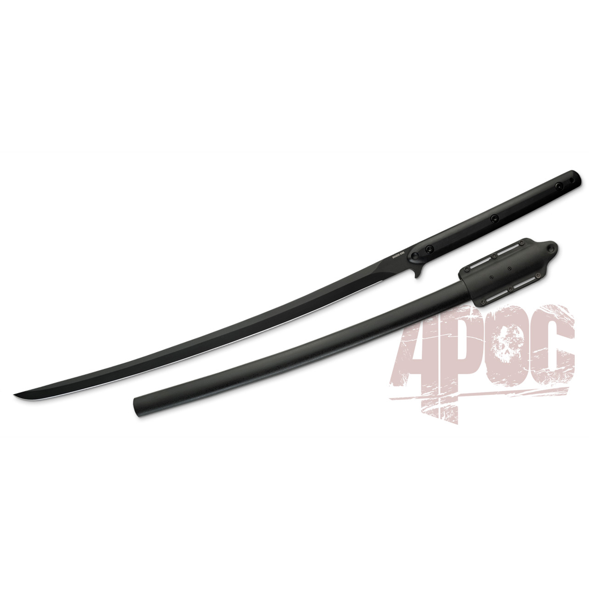 The APOC Katana at a glance looks atypical except for the classic Japanese styled blade. But fans of Gus Trim will recognize his subtle style and perfection in a design thats historically atypical for this famed sword maker. When he was still making this sword, Gus called this model the “Little Tigress” and it’s easy to see why. The 11 3/8 full tang G10 handle glides gently in the hand as the handle slabs, rivets and blade profile are effortlessly flush all around preventing blisters or lesions which eliminates a big problem when combatting in an infectious environment. The hooked guard prevents your fingers from sliding onto the blade edge. The 23 1/2″ blade edge and contour features another Atrim profiling feature allowing precise cuts and slices. At 36 5/8 overall and 2 lbs 6 oz the APOC Katana is hefty enough to split skulls and sever limbs but light enough to not hinder a valiant retreat.
