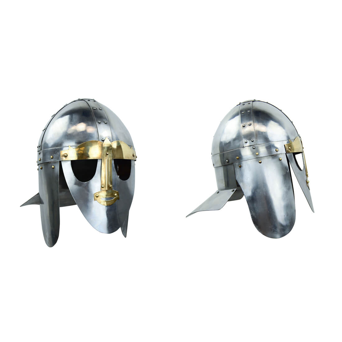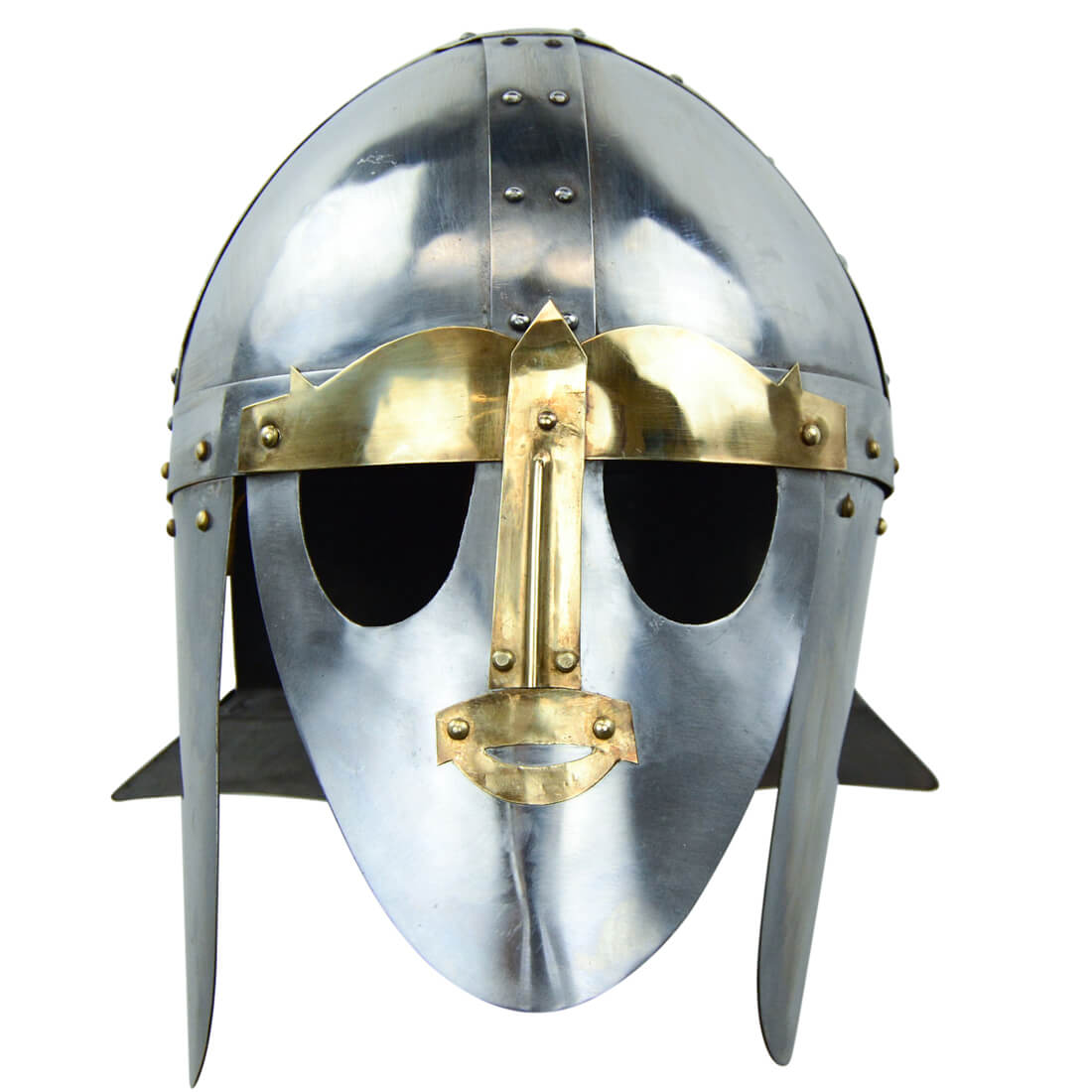 This Sutton Hoo Helm is constructed from 18 gauge steel. The facemask is fitted with brass accents and the cheekplates are hinged. The inside of the helm is unlined.