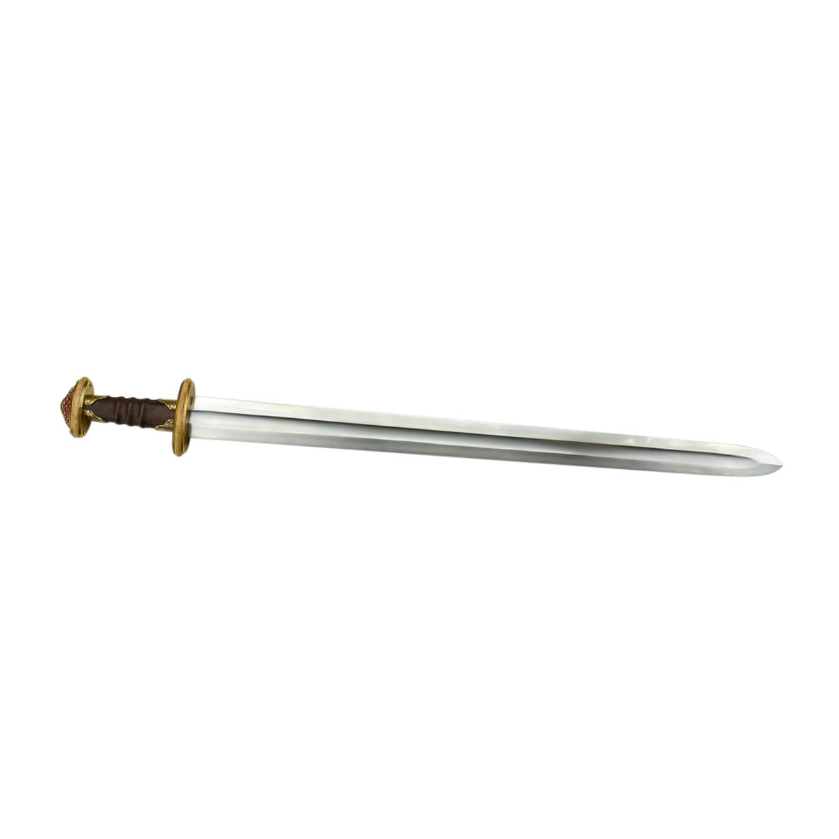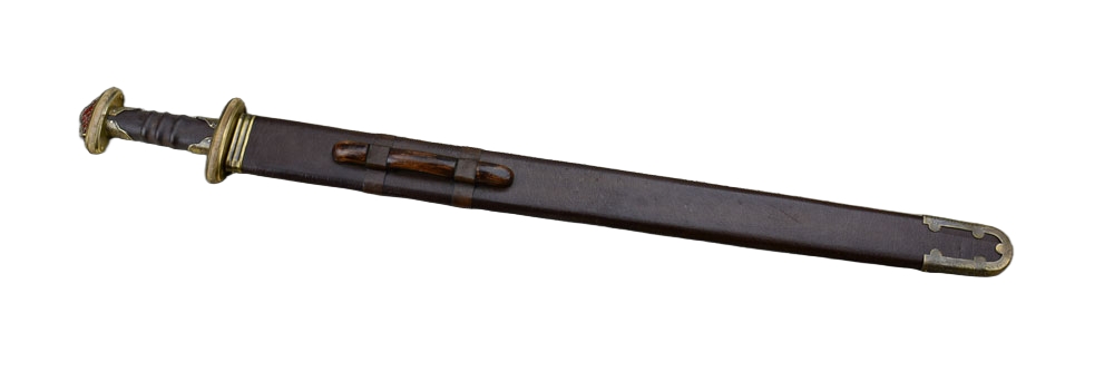 This reproduction of the famous Sutton Hoo sword of the British Museum collection has a blade which is forged from high carbon steel. The hilt has a composite guard and pommel of wood and brass which, like the original, are secured with rivets. The hardwood grip is wrapped in fitted leather and vibrant red enamel inset into the pommel cap replicates the garnet of the original which was inlaid with the cloisonné technique.