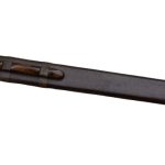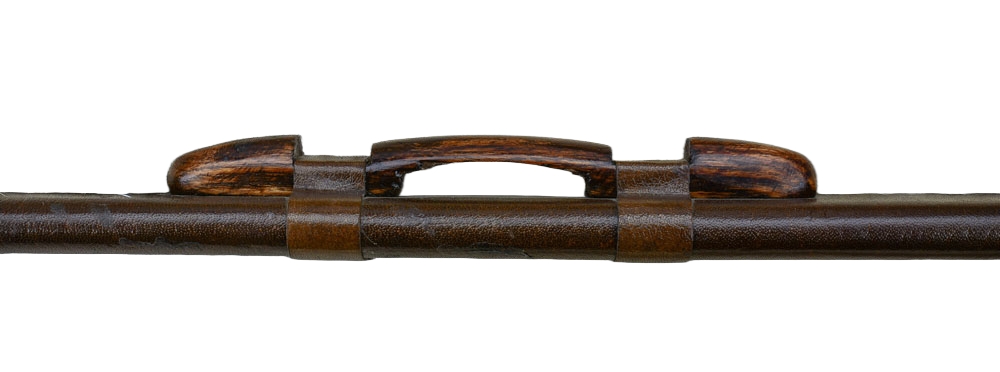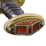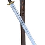 The sword is matched with a wooden scabbard which is wrapped in leather and completed with antiqued brass accents and wooden suspension loop which can be used to wear this sword on a baldric or belt.