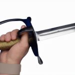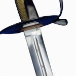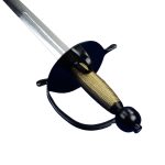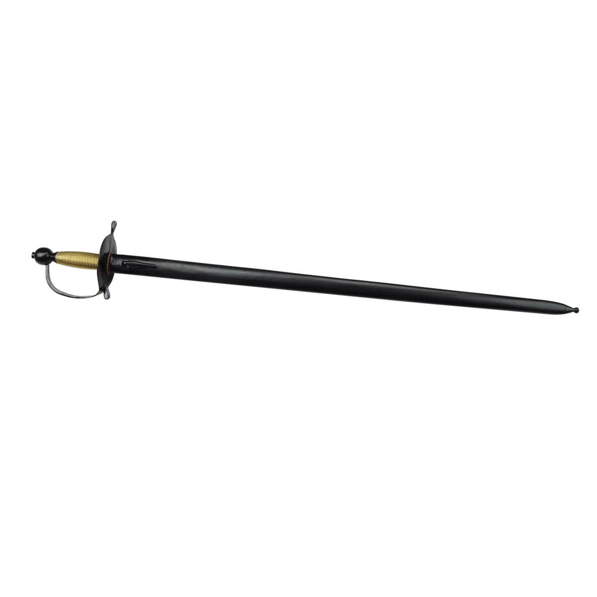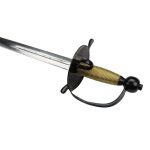 This Swedish Cavalry Sword has a blade of 1055 high carbon steel which is mounted into a blackened steel hilt. The grip is wood which is wrapped in tightly wrapped and braided brass wire. The scabbard is wood with a wrap of leather which is finished with blackened steel fittings.