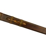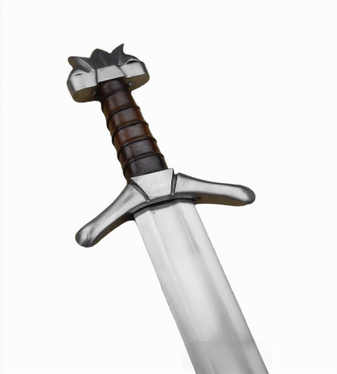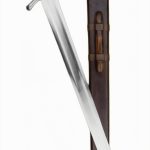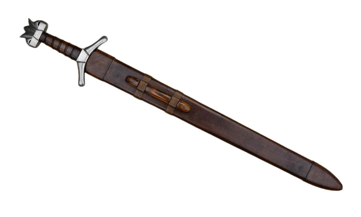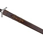 The blade is tempered high carbon steel and the hilt is steel with a wood grip with a leather wrap. The sword comes with a wooden scabbard which is wrapped in leather.
