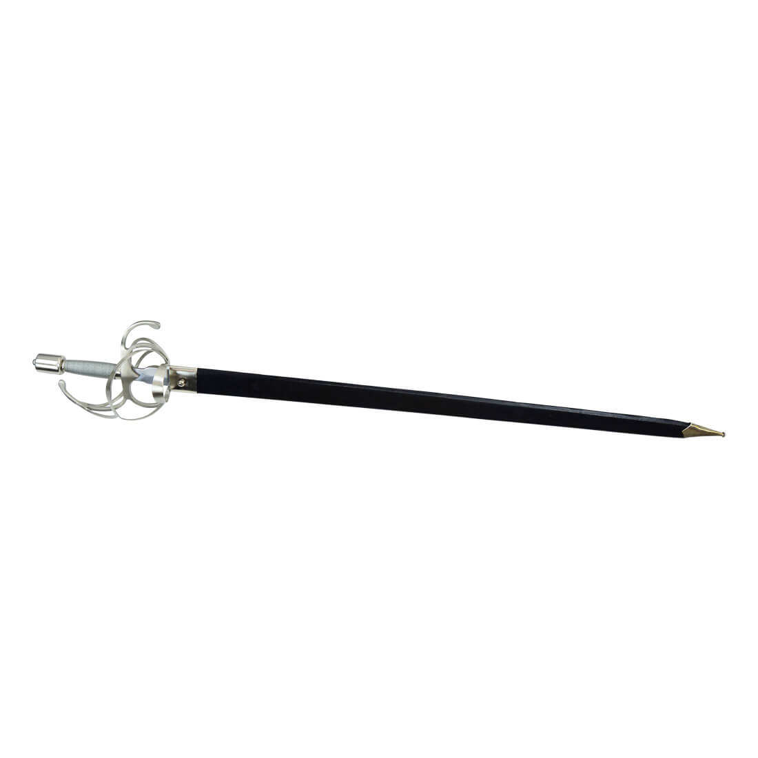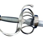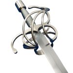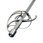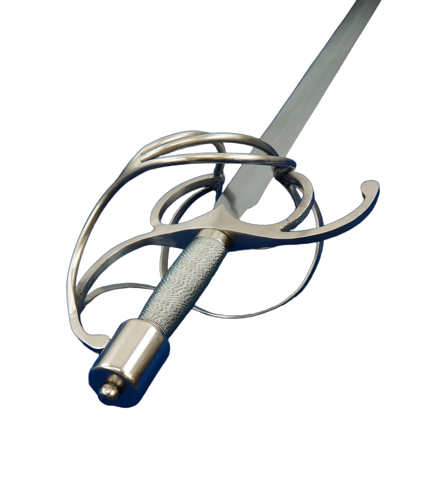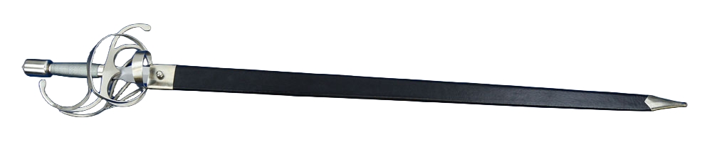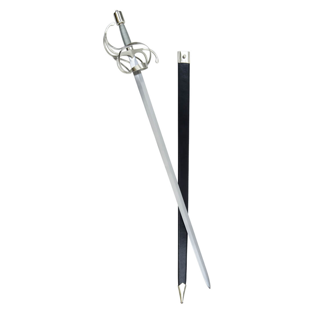 This swept-hilt rapier has a blade of high carbon steel; the hilt is steel and the grip is wood with twisted steel wire. The scabbard is wood with leather and protective steel accents.