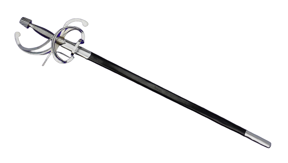 This swept hilt duelists rapier sword has a blade of tempered high carbon steel which is sturdily mounted into a swept style rapier hilt of steel; the grip is wood which has been wrapped in braided steel wire. Included is a leather scabbard with steel fittings.