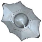 The buckler shield was a small shield used in Europe during the Middle Ages and Renaissance periods. It is characterized by a central handle which makes it easy for a one-handed grip. It typically served as a companion weapon in hand to hand combat, as well as for defense in swordplay. The buckler shield functioned as hand protection, a deflector, a blinder, and a metal fist. There were two styles of buckler shield with one being an oval shape with the handle behind the boss and one with a rectangular shape. Drawing upon this inspiration comes the The Talhofer Grand Master Buckler Shield which is named after Hans Talhoffer, a 15th century fencing master associated with Johannes Liechtenauer, the grand master of the Medieval German school of fencing. He wrote over five fencing manuals over his life time covering many weapons. Featuring 16 gauge steel construction with a black finish, this unique shield handsomely reflects his legacy. It is light weight and convenient to carry. It also promises to be effective for fencing and re-enactments and is a great for costumes and display.